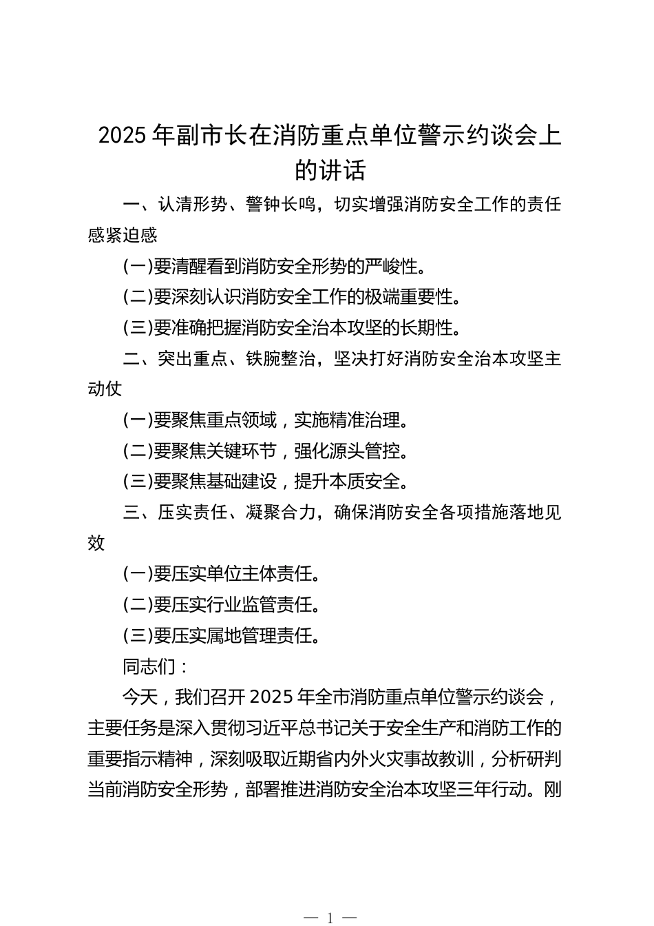 2025年副市長在消防重點單位警示約談會上的講話一、認清形勢、警鐘長鳴,切實增強消防安全工作的責(zé)任感緊迫感(一)要清醒看到消防安全形勢的嚴峻性。(二)要深刻認識消防安全工作的極端重要性。(三)要準確把握消防安全治本攻堅的長期性。二、突出重點、鐵腕整治,堅決打好消防安全治本攻堅主動仗(一)要聚焦重點領(lǐng)域,實施精準治理。(二)要聚焦關(guān)鍵環(huán)節(jié),強化源頭管控。(三)要聚焦基礎(chǔ)建設(shè),提升本質(zhì)安全。三、壓實責(zé)任、凝聚合力,確保消防安全各項措施落地見效(一)要壓實單位主體責(zé)任。(二)要壓實行業(yè)監(jiān)管責(zé)任。(三)要壓實屬地管理責(zé)任。同志們:今天,我們召開2025年全市...