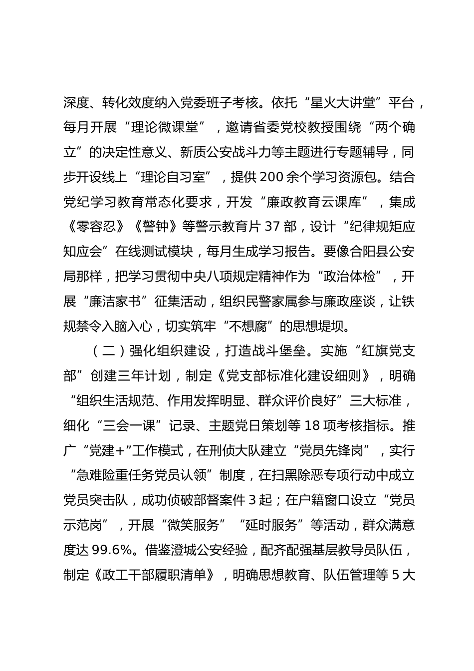 縣公安局黨組副書記在2025年公安隊伍建設(shè)分析研判暨政治工作“八大行動”推進會上的講話今天,我們召開全縣公安隊伍建設(shè)分析研判暨政治工作“八大行動”推進會,主要任務(wù)是深入貫徹XXX新時代中國特色社會主義思想,全面落實公安部、省廳關(guān)于政治工作服務(wù)保障公安工作現(xiàn)代化的部署要求,總結(jié)階段性成效,分析當前形勢,部署下階段重點任務(wù)。剛才,相關(guān)部門負責同志作了述職發(fā)言,講得都很實在。下面,我代表局黨組講三點意見。一、堅持政治建警鑄魂,在固本培元中夯實忠誠根基公安機關(guān)是黨和人民手中的“刀把子”,必須把旗幟鮮明講政治作為第一要求。近年來,我們通過開...