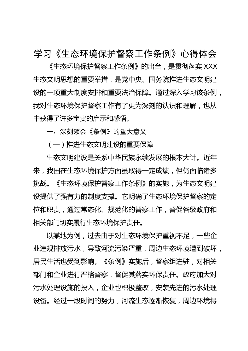 學(xué)習(xí)《生態(tài)環(huán)境保護督察工作條例》心得體會《生態(tài)環(huán)境保護督察工作條例》的出臺,是貫徹落實XXX生態(tài)文明思想的重要舉措,是黨中央、國務(wù)院推進生態(tài)文明建設(shè)的一項重大制度安排和重要法治保障。通過深入學(xué)習(xí)該條例,我對生態(tài)環(huán)境保護督察工作有了更為深刻的認識和理解,也從中獲得了許多寶貴的啟示和感悟。一、深刻領(lǐng)會《條例》的重大意義(一)推進生態(tài)文明建設(shè)的重要保障生態(tài)文明建設(shè)是關(guān)系中華民族永續(xù)發(fā)展的根本大計。近年來,我國在生態(tài)環(huán)境保護方面雖取得一定成績,但仍面臨諸多挑戰(zhàn)?!渡鷳B(tài)環(huán)境保護督察工作條例》的實施,為生態(tài)文明建設(shè)提供了強有力的制度支撐。...
