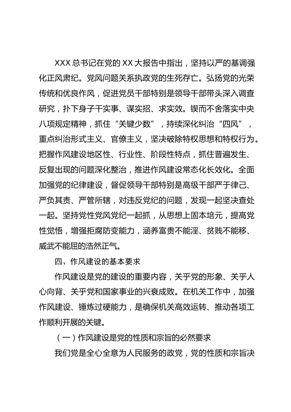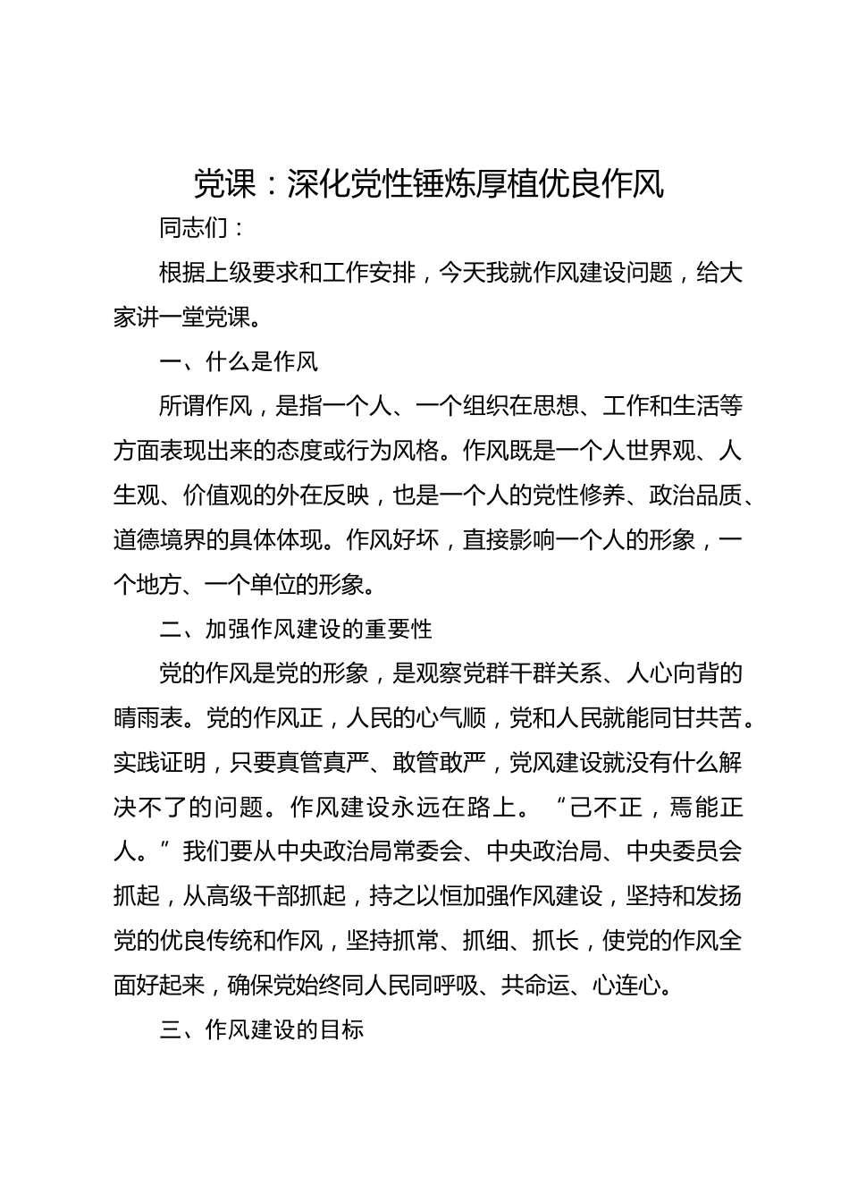 黨課:深化黨性錘煉厚植優(yōu)良作風(fēng)同志們:根據(jù)上級(jí)要求和工作安排,今天我就作風(fēng)建設(shè)問題,給大家講一堂黨課。一、什么是作風(fēng)所謂作風(fēng),是指一個(gè)人、一個(gè)組織在思想、工作和生活等方面表現(xiàn)出來的態(tài)度或行為風(fēng)格。作風(fēng)既是一個(gè)人世界觀、人生觀、價(jià)值觀的外在反映,也是一個(gè)人的黨性修養(yǎng)、政治品質(zhì)、道德境界的具體體現(xiàn)。作風(fēng)好壞,直接影響一個(gè)人的形象,一個(gè)地方、一個(gè)單位的形象。二、加強(qiáng)作風(fēng)建設(shè)的重要性黨的作風(fēng)是黨的形象,是觀察黨群干群關(guān)系、人心向背的晴雨表。黨的作風(fēng)正,人民的心氣順,黨和人民就能同甘共苦。實(shí)踐證明,只要真管真嚴(yán)、敢管敢嚴(yán),黨風(fēng)建設(shè)就沒...
