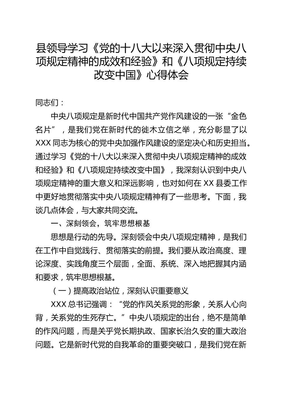 縣領(lǐng)導(dǎo)學(xué)習(xí)《黨的十八大以來深入貫徹中央八項(xiàng)規(guī)定精神的成效和經(jīng)驗(yàn)》和《八項(xiàng)規(guī)定持續(xù)改變中國》心得體會VIP免費(fèi)