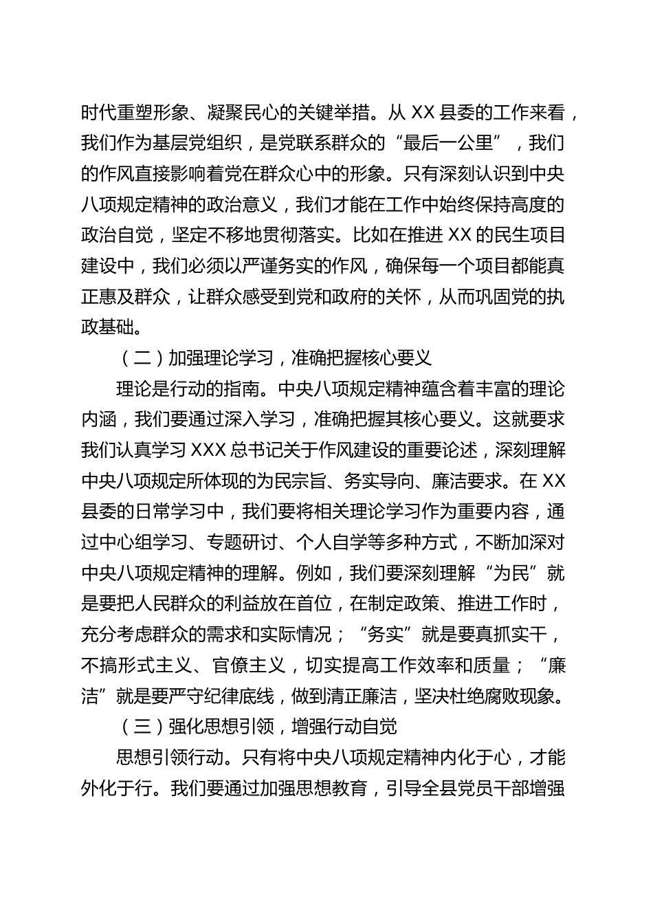 縣領(lǐng)導(dǎo)學(xué)習(xí)《黨的十八大以來深入貫徹中央八項(xiàng)規(guī)定精神的成效和經(jīng)驗(yàn)》和《八項(xiàng)規(guī)定持續(xù)改變中國》心得體會同志們:中央八項(xiàng)規(guī)定是新時代中國共產(chǎn)黨作風(fēng)建設(shè)的一張“金色名片”,是我們黨在新時代的徙木立信之舉,充分彰顯了以XXX同志為核心的黨中央加強(qiáng)作風(fēng)建設(shè)的堅定決心和歷史擔(dān)當(dāng)。通過學(xué)習(xí)《黨的十八大以來深入貫徹中央八項(xiàng)規(guī)定精神的成效和經(jīng)驗(yàn)》和《八項(xiàng)規(guī)定持續(xù)改變中國》,我深刻認(rèn)識到中央八項(xiàng)規(guī)定精神的重大意義和深遠(yuǎn)影響,也對如何在XX縣委工作中更好地貫徹落實(shí)中央八項(xiàng)規(guī)定精神有了一些思考。下面,我談幾點(diǎn)體會,與大家共同交流。一、深刻領(lǐng)會,筑牢思想根...