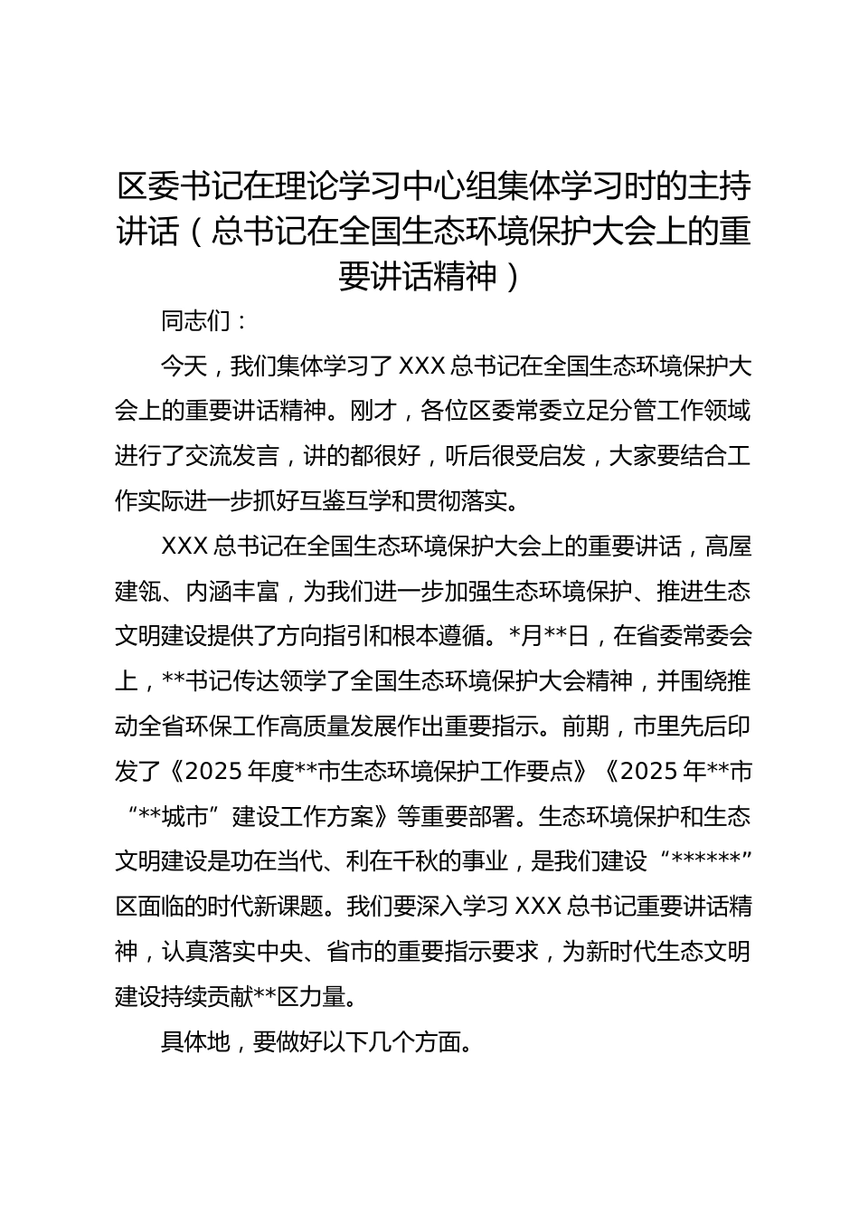 區(qū)委書記在理論學習中心組集體學習時的主持講話(總書記在全國生態(tài)環(huán)境保護大會上的重要講話精神)同志們:今天,我們集體學習了XXX總書記在全國生態(tài)環(huán)境保護大會上的重要講話精神。剛才,各位區(qū)委常委立足分管工作領域進行了交流發(fā)言,講的都很好,聽后很受啟發(fā),大家要結合工作實際進一步抓好互鑒互學和貫徹落實。XXX總書記在全國生態(tài)環(huán)境保護大會上的重要講話,高屋建瓴、內(nèi)涵豐富,為我們進一步加強生態(tài)環(huán)境保護、推進生態(tài)文明建設提供了方向指引和根本遵循。*月**日,在省委常委會上,**書記傳達領學了全國生態(tài)環(huán)境保護大會精神,并圍繞推動全省環(huán)保工作高質(zhì)量發(fā)展...