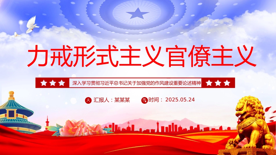 匯報(bào)人:某某某時(shí)間:2025.05.24力戒形式主義官僚主義深入學(xué)習(xí)貫徹習(xí)近平總書(shū)記關(guān)于加強(qiáng)黨的作風(fēng)建設(shè)重要論述精神黨的作風(fēng)就是黨的形象,關(guān)系人心向背,決定黨和國(guó)家事業(yè)成敗。黨的十八大以來(lái),習(xí)近平總書(shū)記站在黨和國(guó)家事業(yè)發(fā)展全局的戰(zhàn)略高度,圍繞加強(qiáng)黨的作風(fēng)建設(shè)發(fā)表一系列重要論述,提出一系列新思想新觀點(diǎn)新論斷,為力戒形式主義、官僚主義提供了科學(xué)指引。我們要堅(jiān)持深學(xué)細(xì)悟,把握核心要義、領(lǐng)悟精神實(shí)質(zhì)、明確實(shí)踐要求,堅(jiān)持好、運(yùn)用好貫穿其中的立場(chǎng)觀點(diǎn)方法,持之以恒加強(qiáng)黨的作風(fēng)建設(shè),持續(xù)深入糾治形式主義、官僚主義,推動(dòng)深入貫徹中央八項(xiàng)規(guī)定精神學(xué)習(xí)教...