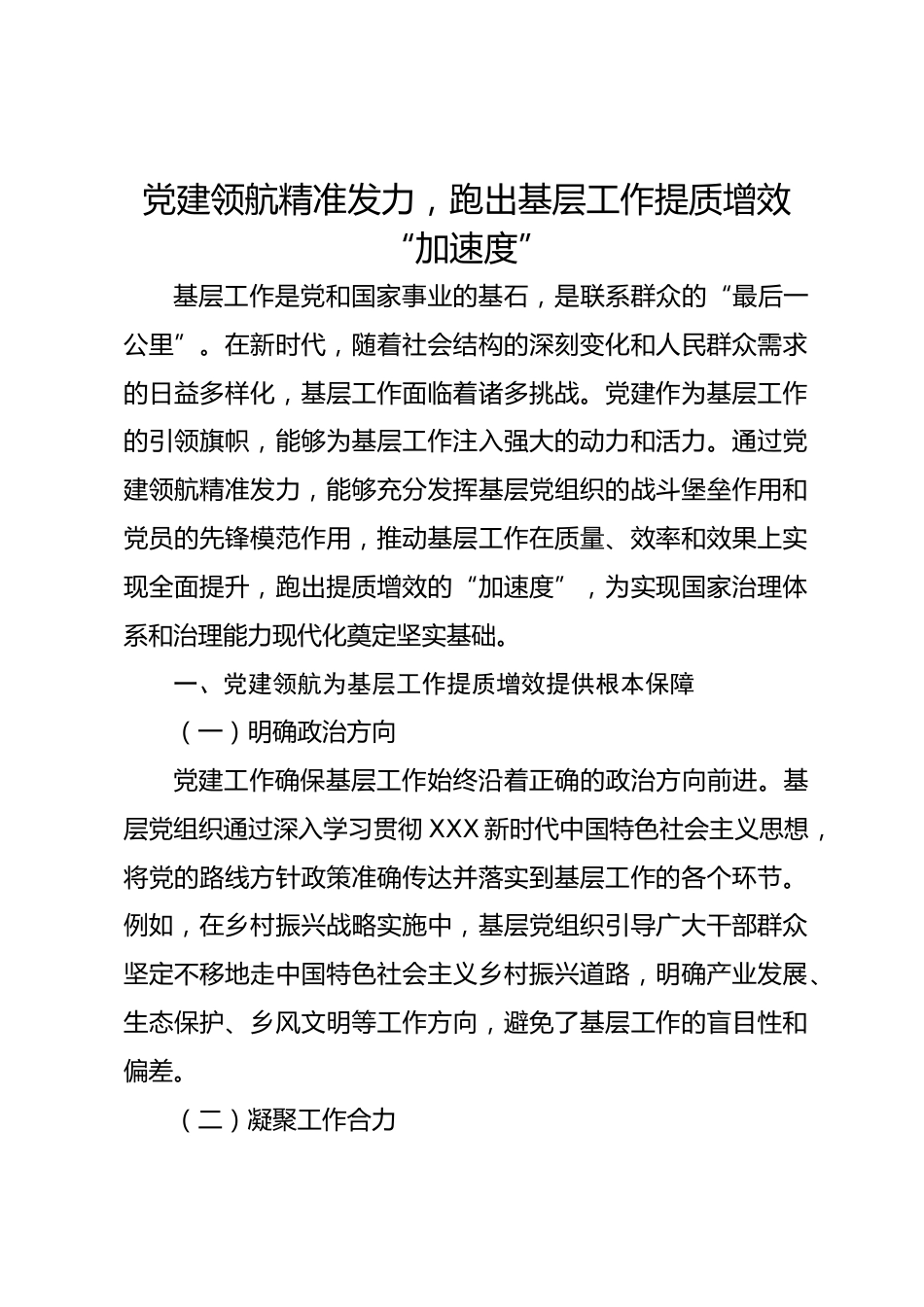 黨建領航精準發(fā)力,跑出基層工作提質增效“加速度”基層工作是黨和國家事業(yè)的基石,是聯(lián)系群眾的“最后一公里”。在新時代,隨著社會結構的深刻變化和人民群眾需求的日益多樣化,基層工作面臨著諸多挑戰(zhàn)。黨建作為基層工作的引領旗幟,能夠為基層工作注入強大的動力和活力。通過黨建領航精準發(fā)力,能夠充分發(fā)揮基層黨組織的戰(zhàn)斗堡壘作用和黨員的先鋒模范作用,推動基層工作在質量、效率和效果上實現(xiàn)全面提升,跑出提質增效的“加速度”,為實現(xiàn)國家治理體系和治理能力現(xiàn)代化奠定堅實基礎。一、黨建領航為基層工作提質增效提供根本保障(一)明確政治方向黨建工作確?;鶎?..
