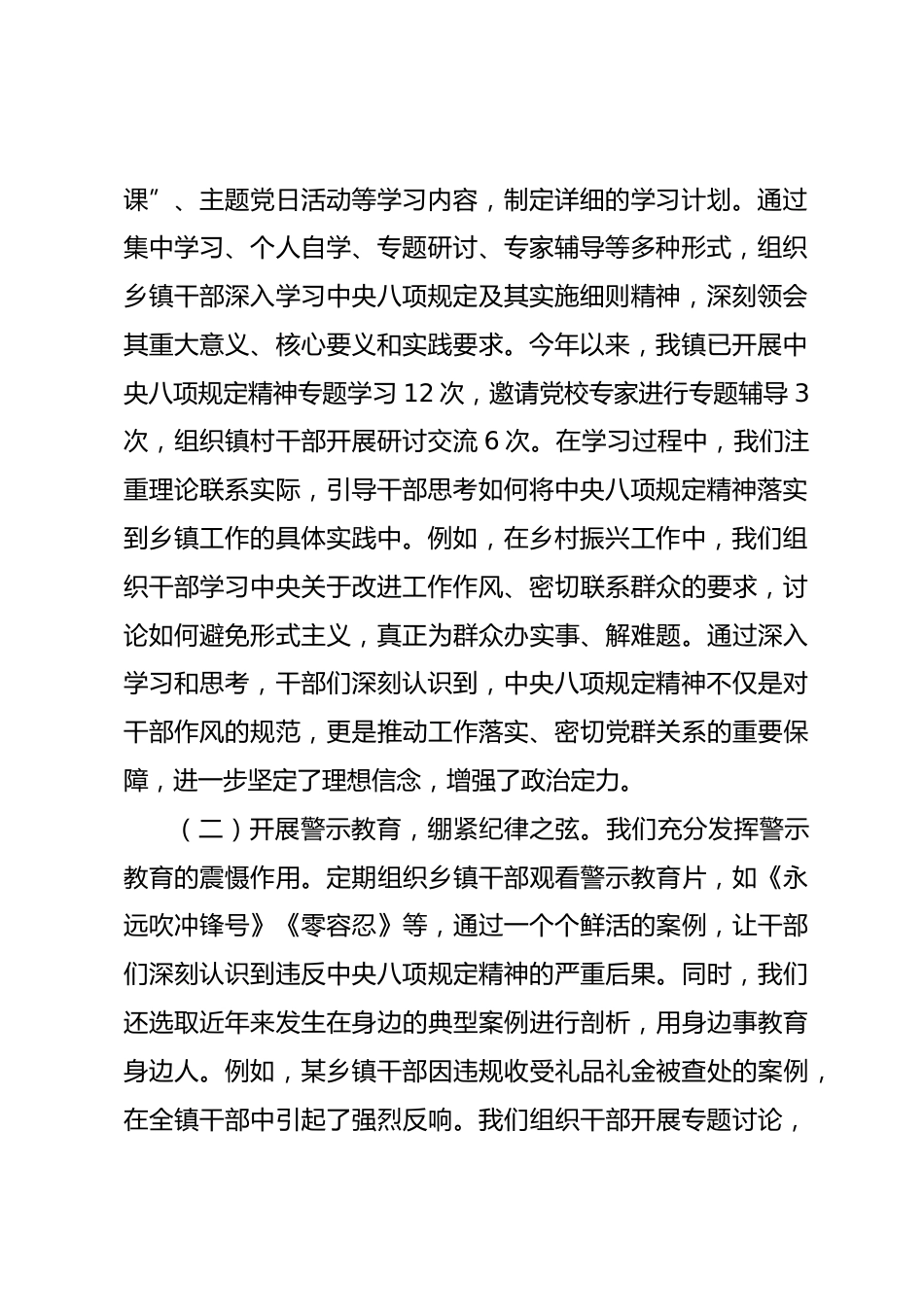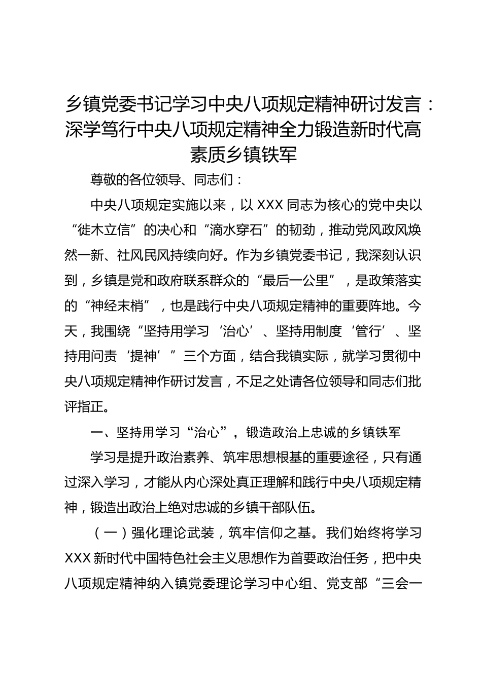 鄉(xiāng)鎮(zhèn)黨委書(shū)記學(xué)習(xí)中央八項(xiàng)規(guī)定精神研討發(fā)言:深學(xué)篤行中央八項(xiàng)規(guī)定精神全力鍛造新時(shí)代高素質(zhì)鄉(xiāng)鎮(zhèn)鐵軍尊敬的各位領(lǐng)導(dǎo)、同志們:中央八項(xiàng)規(guī)定實(shí)施以來(lái),以XXX同志為核心的黨中央以“徙木立信”的決心和“滴水穿石”的韌勁,推動(dòng)黨風(fēng)政風(fēng)煥然一新、社風(fēng)民風(fēng)持續(xù)向好。作為鄉(xiāng)鎮(zhèn)黨委書(shū)記,我深刻認(rèn)識(shí)到,鄉(xiāng)鎮(zhèn)是黨和政府聯(lián)系群眾的“最后一公里”,是政策落實(shí)的“神經(jīng)末梢”,也是踐行中央八項(xiàng)規(guī)定精神的重要陣地。今天,我圍繞“堅(jiān)持用學(xué)習(xí)‘治心’、堅(jiān)持用制度‘管行’、堅(jiān)持用問(wèn)責(zé)‘提神’”三個(gè)方面,結(jié)合我鎮(zhèn)實(shí)際,就學(xué)習(xí)貫徹中央八項(xiàng)規(guī)定精神作研討發(fā)言,不足之處請(qǐng)各位...