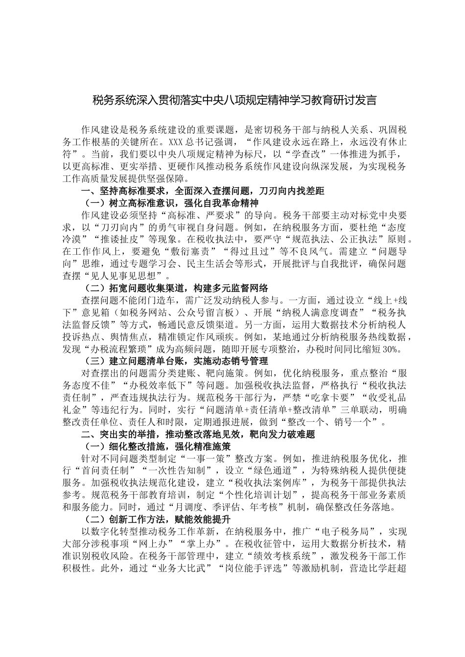 稅務系統(tǒng)深入貫徹落實中央八項規(guī)定精神學習教育研討發(fā)言作風建設是稅務系統(tǒng)建設的重要課題,是密切稅務干部與納稅人關系、鞏固稅務工作根基的關鍵所在。XXX總書記強調,“作風建設永遠在路上,永遠沒有休止符”。當前,我們要以中央八項規(guī)定精神為標尺,以“學查改”一體推進為抓手,以更高標準、更實舉措、更硬作風推動稅務系統(tǒng)作風建設向縱深發(fā)展,為實現(xiàn)稅務工作高質量發(fā)展提供堅強保障。一、堅持高標準要求,全面深入查擺問題,刀刃向內找差距(一)樹立高標準意識,強化自我革命精神作風建設必須堅持“高標準、嚴要求”的導向。稅務干部要主動對標黨中央要求,以“...