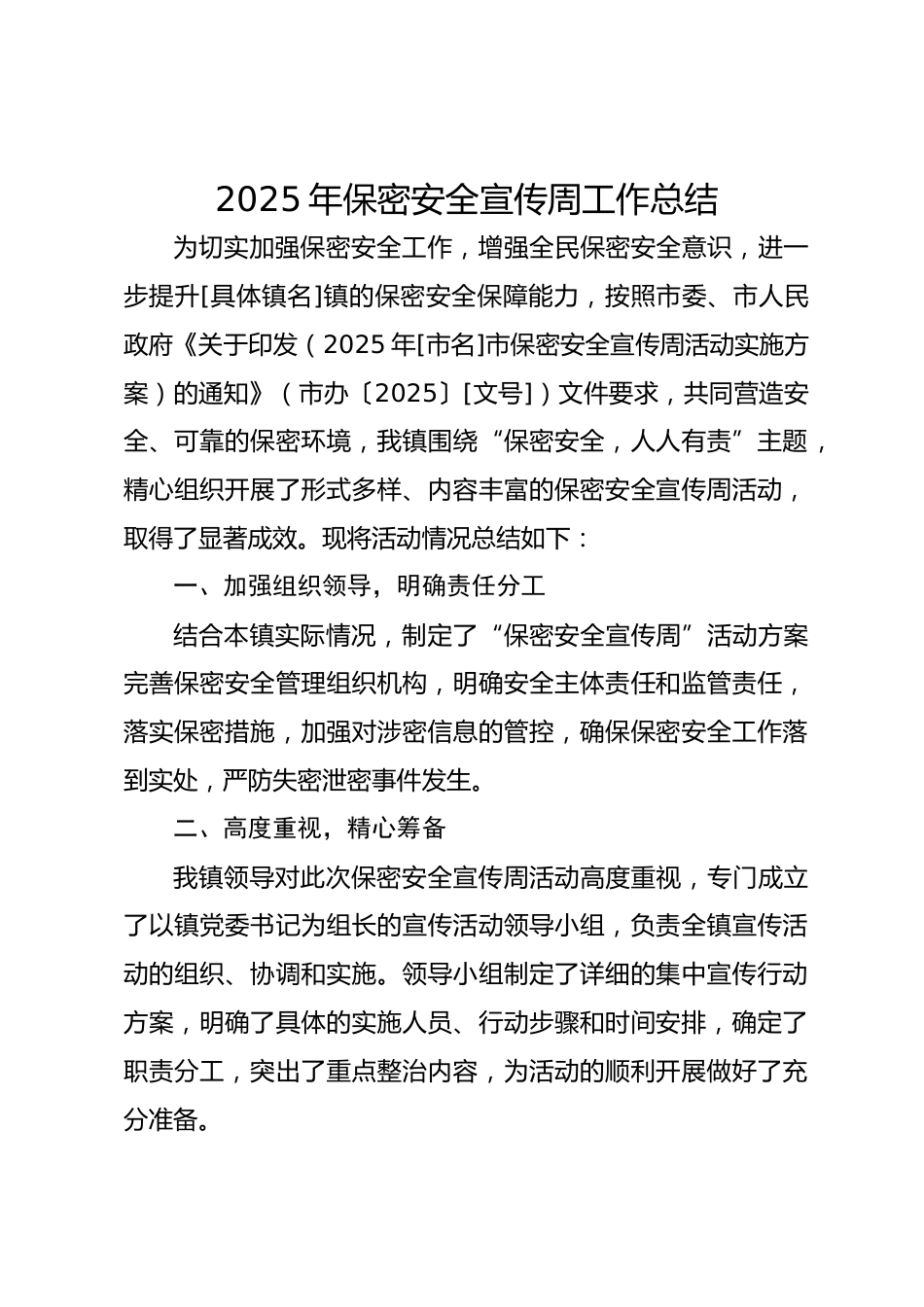 2025年保密安全宣傳周工作總結為切實加強保密安全工作,增強全民保密安全意識,進一步提升[具體鎮(zhèn)名]鎮(zhèn)的保密安全保障能力,按照市委、市人民政府《關于印發(fā)(2025年[市名]市保密安全宣傳周活動實施方案)的通知》(市辦〔2025〕[文號])文件要求,共同營造安全、可靠的保密環(huán)境,我鎮(zhèn)圍繞“保密安全,人人有責”主題,精心組織開展了形式多樣、內容豐富的保密安全宣傳周活動,取得了顯著成效?,F(xiàn)將活動情況總結如下:一、加強組織領導,明確責任分工結合本鎮(zhèn)實際情況,制定了“保密安全宣傳周”活動方案完善保密安全管理組織機構,明確安全主體責任和監(jiān)管責任,落實保密...