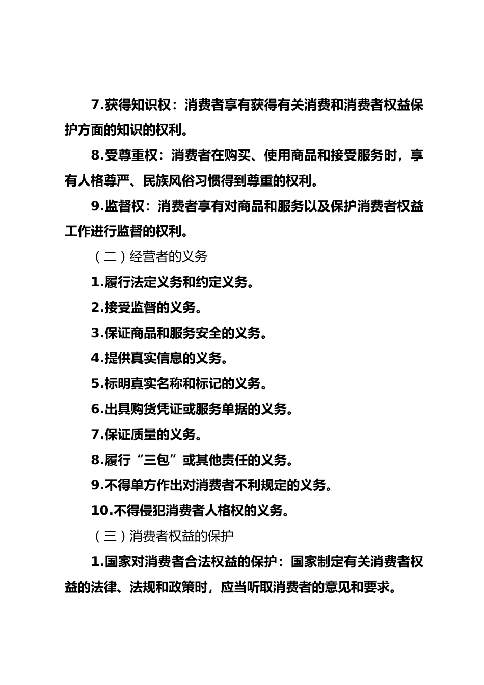 日常法律法規(guī)基礎(chǔ)知識(shí)宣傳資料在我們的日常生活中,除了憲法和民法典,還有許多其他法律法規(guī)對(duì)我們的行為和權(quán)益進(jìn)行規(guī)范和保護(hù)。了解這些法律法規(guī)的基礎(chǔ)知識(shí),有助于我們更好地遵守法律,維護(hù)自己的合法權(quán)益,同時(shí)也有助于促進(jìn)社會(huì)的和諧與穩(wěn)定。以下是一些常見(jiàn)的日常法律法規(guī)的基礎(chǔ)知識(shí)介紹:一、《消費(fèi)者權(quán)益保護(hù)法》(一)消費(fèi)者的權(quán)利1.安全權(quán):消費(fèi)者在購(gòu)買、使用商品和接受服務(wù)時(shí)享有人身、財(cái)產(chǎn)安全不受損害的權(quán)利。2.知情權(quán):消費(fèi)者享有知悉其購(gòu)買、使用的商品或者接受的服務(wù)的真實(shí)情況的權(quán)利。3.自主選擇權(quán):消費(fèi)者享有自主選擇商品或者服務(wù)的權(quán)利。4.公平交易權(quán)...