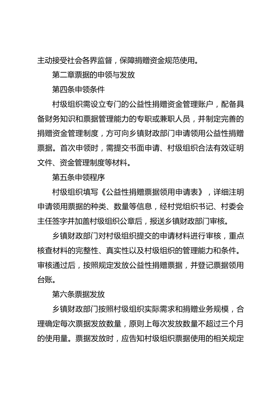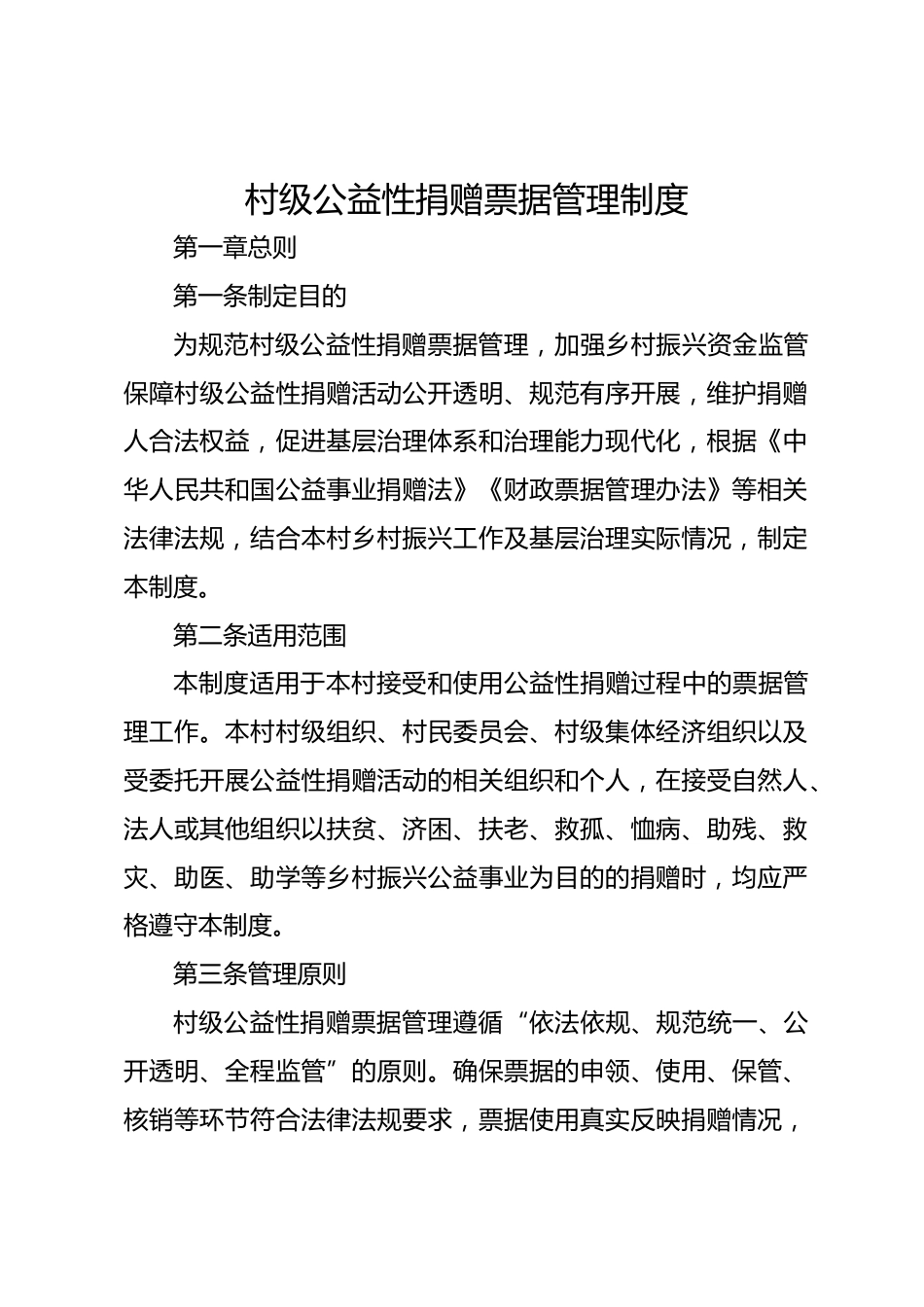 村級公益性捐贈票據(jù)管理制度第一章總則第一條制定目的為規(guī)范村級公益性捐贈票據(jù)管理,加強鄉(xiāng)村振興資金監(jiān)管保障村級公益性捐贈活動公開透明、規(guī)范有序開展,維護捐贈人合法權益,促進基層治理體系和治理能力現(xiàn)代化,根據(jù)《中華人民共和國公益事業(yè)捐贈法》《財政票據(jù)管理辦法》等相關法律法規(guī),結合本村鄉(xiāng)村振興工作及基層治理實際情況,制定本制度。第二條適用范圍本制度適用于本村接受和使用公益性捐贈過程中的票據(jù)管理工作。本村村級組織、村民委員會、村級集體經(jīng)濟組織以及受委托開展公益性捐贈活動的相關組織和個人,在接受自然人、法人或其他組織以扶貧、濟困、扶老...