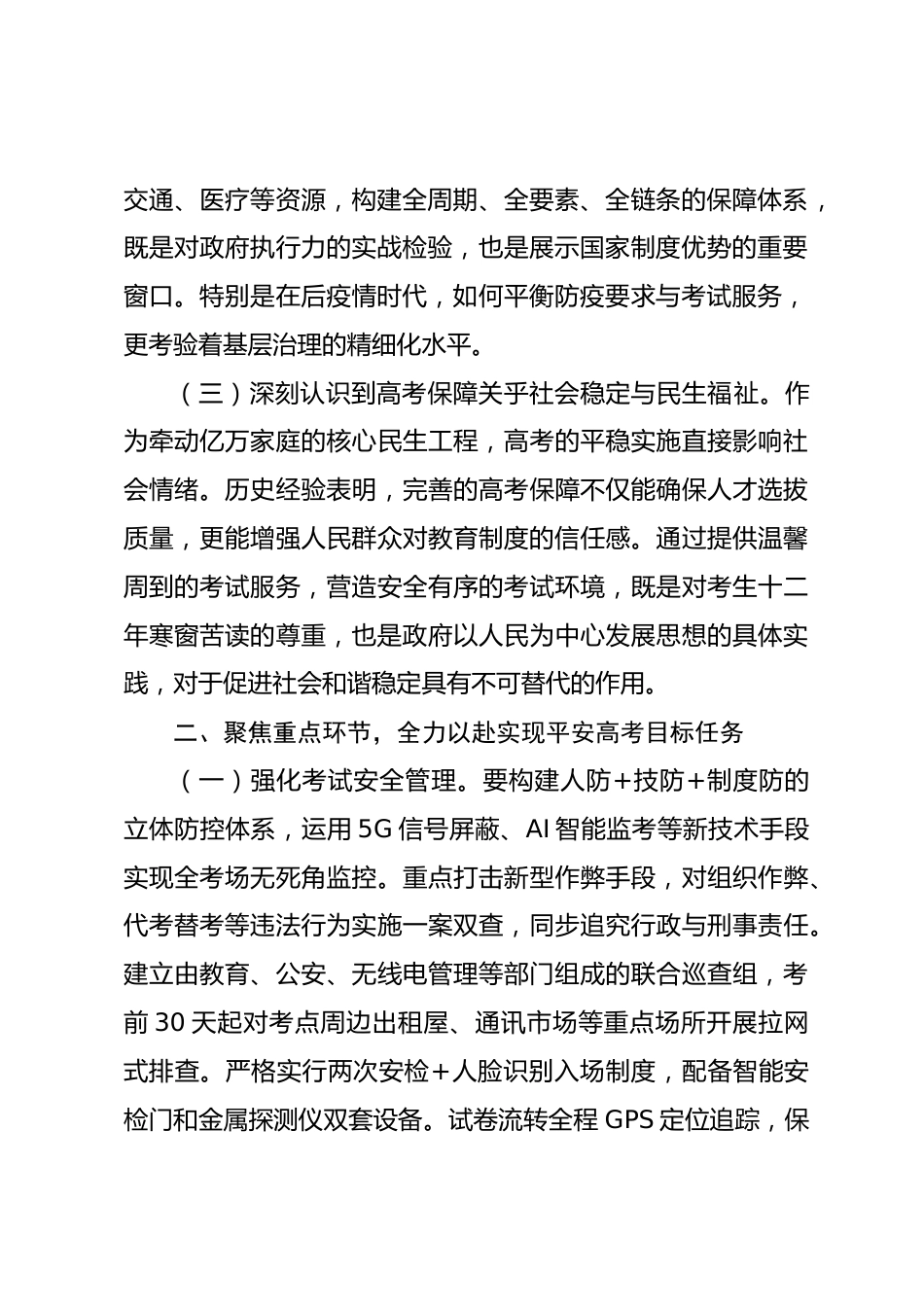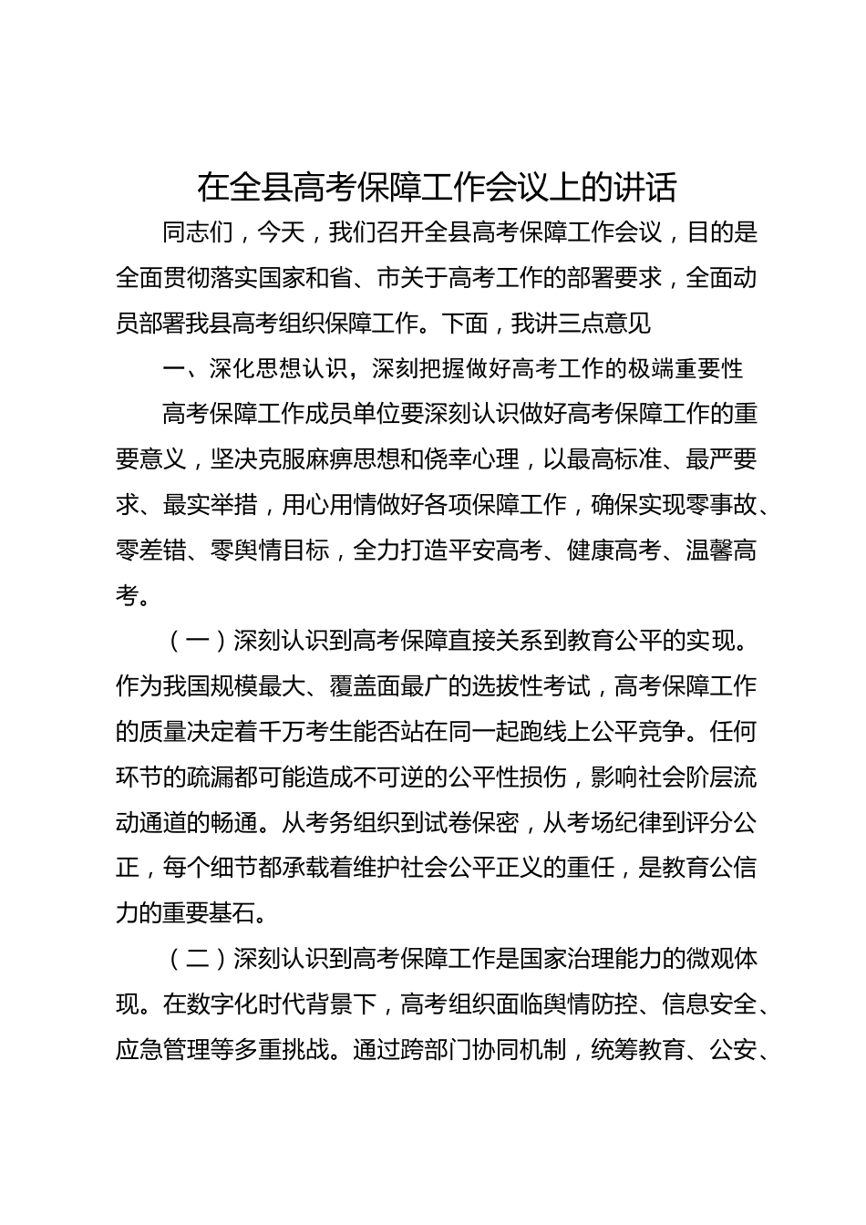 在全縣高考保障工作會議上的講話同志們,今天,我們召開全縣高考保障工作會議,目的是全面貫徹落實國家和省、市關于高考工作的部署要求,全面動員部署我縣高考組織保障工作。下面,我講三點意見一、深化思想認識,深刻把握做好高考工作的極端重要性高考保障工作成員單位要深刻認識做好高考保障工作的重要意義,堅決克服麻痹思想和僥幸心理,以最高標準、最嚴要求、最實舉措,用心用情做好各項保障工作,確保實現(xiàn)零事故、零差錯、零輿情目標,全力打造平安高考、健康高考、溫馨高考。(一)深刻認識到高考保障直接關系到教育公平的實現(xiàn)。作為我國規(guī)模最大、覆蓋面最廣的選...