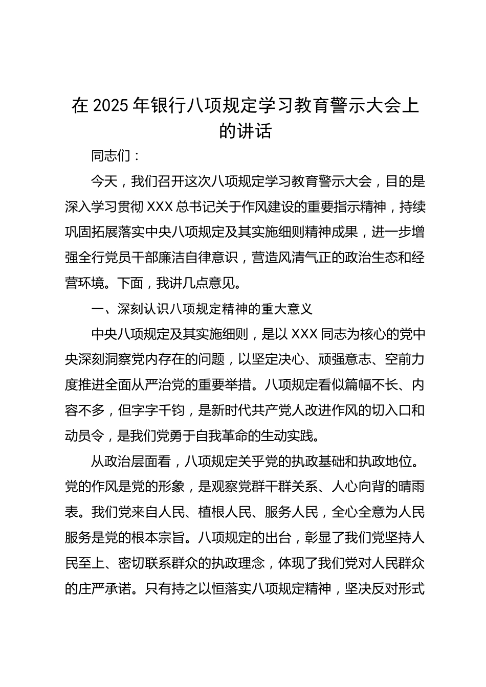 2025年銀行黨委書(shū)記八項(xiàng)規(guī)定學(xué)習(xí)教育警示大會(huì)上的講話稿VIP免費(fèi)
