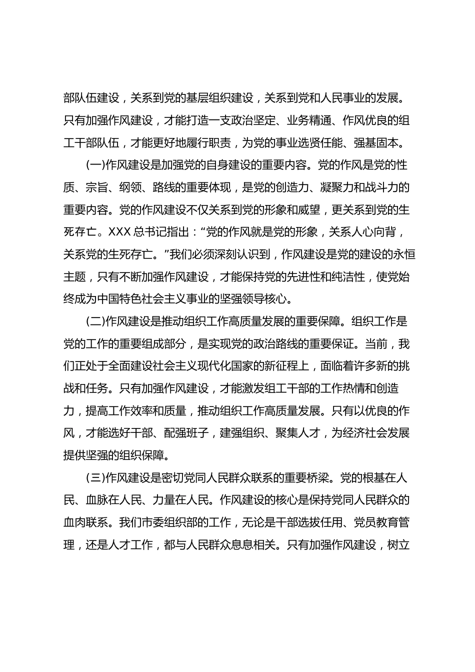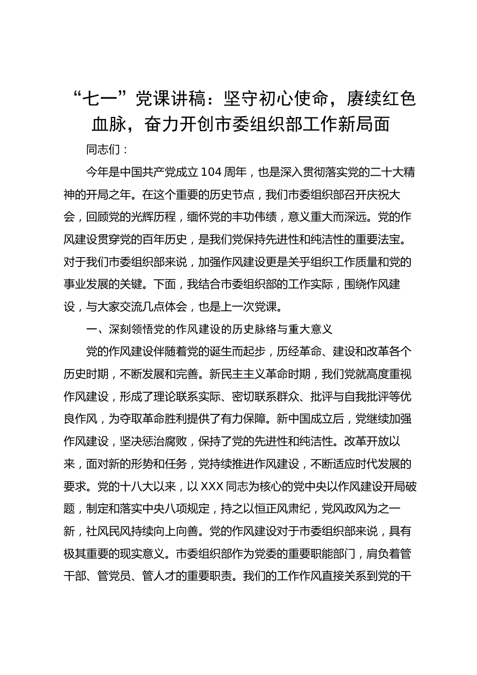 “七一”黨課講稿:堅(jiān)守初心使命,賡續(xù)紅色血脈,奮力開創(chuàng)市委組織部工作新局面同志們:今年是中國共產(chǎn)黨成立104周年,也是深入貫徹落實(shí)黨的二十大精神的開局之年。在這個(gè)重要的歷史節(jié)點(diǎn),我們市委組織部召開慶祝大會(huì),回顧黨的光輝歷程,緬懷黨的豐功偉績,意義重大而深遠(yuǎn)。黨的作風(fēng)建設(shè)貫穿黨的百年歷史,是我們黨保持先進(jìn)性和純潔性的重要法寶。對于我們市委組織部來說,加強(qiáng)作風(fēng)建設(shè)更是關(guān)乎組織工作質(zhì)量和黨的事業(yè)發(fā)展的關(guān)鍵。下面,我結(jié)合市委組織部的工作實(shí)際,圍繞作風(fēng)建設(shè),與大家交流幾點(diǎn)體會(huì),也是上一次黨課。一、深刻領(lǐng)悟黨的作風(fēng)建設(shè)的歷史脈絡(luò)與重大意義...