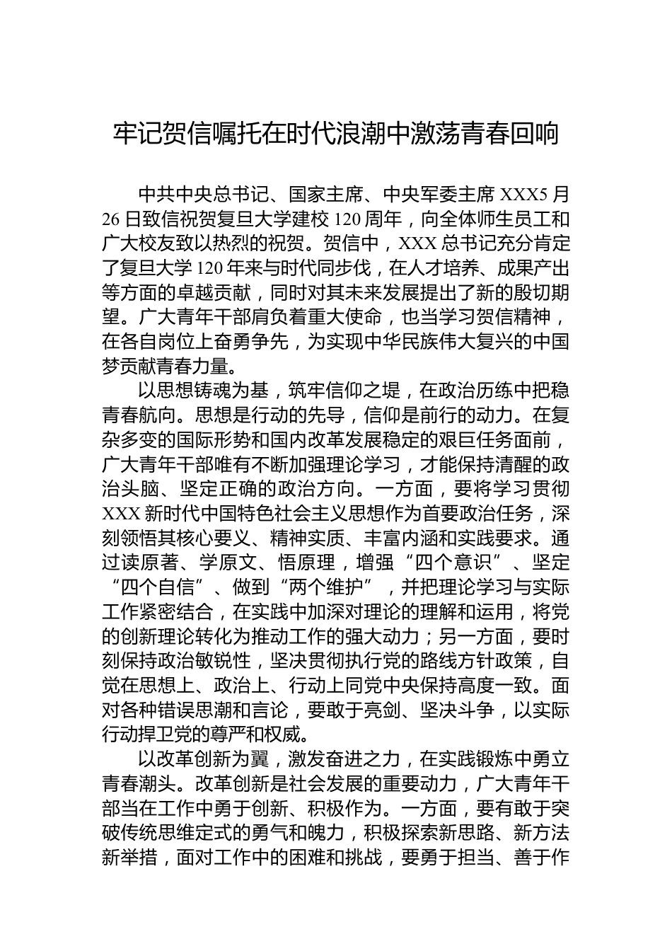 牢記賀信囑托在時(shí)代浪潮中激蕩青春回響中共中央總書(shū)記、國(guó)家主席、中央軍委主席XXX5月26日致信祝賀復(fù)旦大學(xué)建校120周年,向全體師生員工和廣大校友致以熱烈的祝賀。賀信中,XXX總書(shū)記充分肯定了復(fù)旦大學(xué)120年來(lái)與時(shí)代同步伐,在人才培養(yǎng)、成果產(chǎn)出等方面的卓越貢獻(xiàn),同時(shí)對(duì)其未來(lái)發(fā)展提出了新的殷切期望。廣大青年干部肩負(fù)著重大使命,也當(dāng)學(xué)習(xí)賀信精神,在各自崗位上奮勇?tīng)?zhēng)先,為實(shí)現(xiàn)中華民族偉大復(fù)興的中國(guó)夢(mèng)貢獻(xiàn)青春力量。以思想鑄魂為基,筑牢信仰之堤,在政治歷練中把穩(wěn)青春航向。思想是行動(dòng)的先導(dǎo),信仰是前行的動(dòng)力。在復(fù)雜多變的國(guó)際形勢(shì)和國(guó)內(nèi)改革發(fā)展穩(wěn)定的艱...
