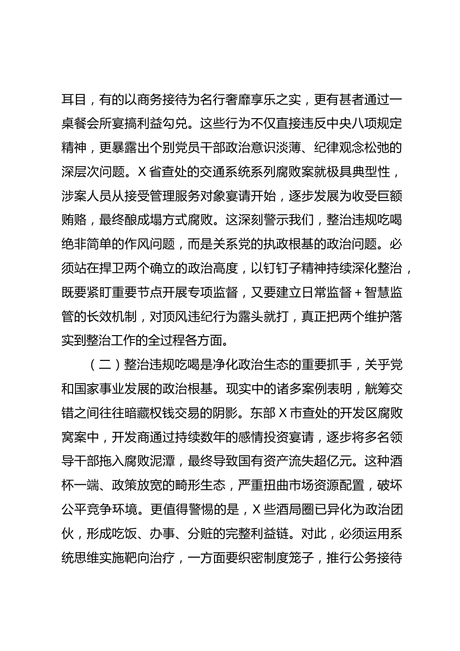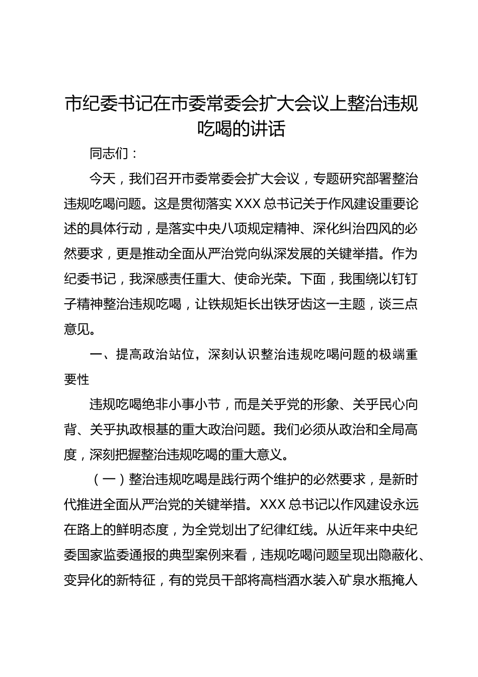 市紀委書記在市委常委會擴大會議上整治違規(guī)吃喝的講話同志們:今天,我們召開市委常委會擴大會議,專題研究部署整治違規(guī)吃喝問題。這是貫徹落實XXX總書記關(guān)于作風建設(shè)重要論述的具體行動,是落實中央八項規(guī)定精神、深化糾治四風的必然要求,更是推動全面從嚴治黨向縱深發(fā)展的關(guān)鍵舉措。作為紀委書記,我深感責任重大、使命光榮。下面,我圍繞以釘釘子精神整治違規(guī)吃喝,讓鐵規(guī)矩長出鐵牙齒這一主題,談三點意見。一、提高政治站位,深刻認識整治違規(guī)吃喝問題的極端重要性違規(guī)吃喝絕非小事小節(jié),而是關(guān)乎黨的形象、關(guān)乎民心向背、關(guān)乎執(zhí)政根基的重大政治問題。我們必須從...