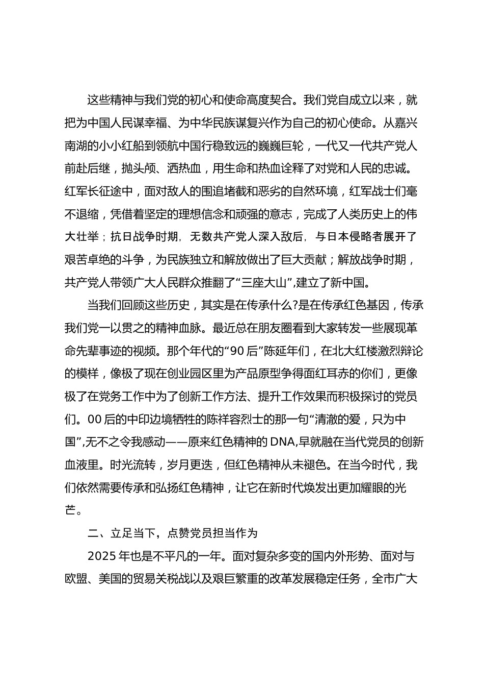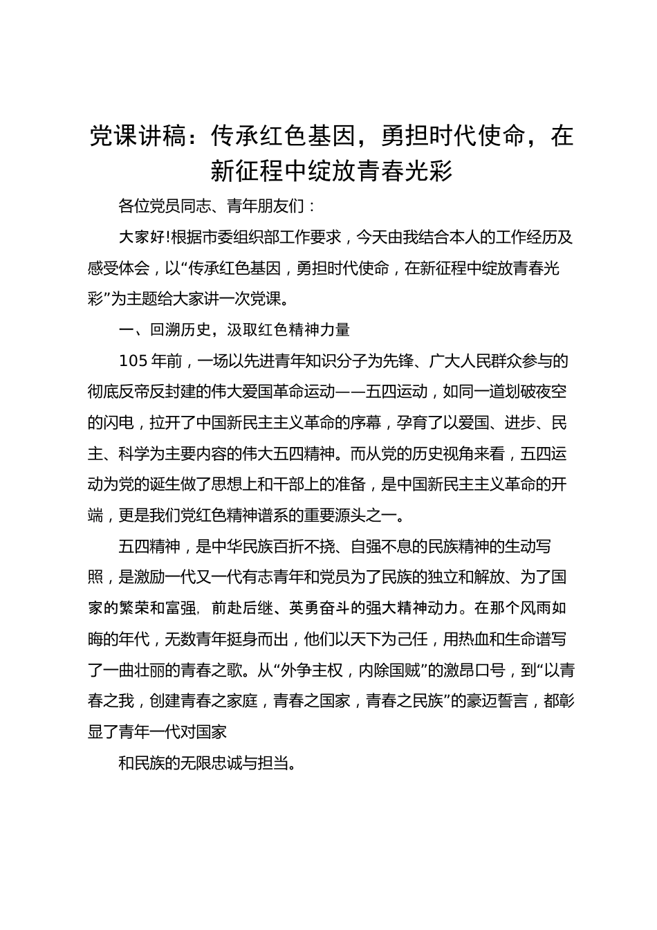 黨課講稿:傳承紅色基因,勇?lián)鷷r代使命,在新征程中綻放青春光彩各位黨員同志、青年朋友們:大家好!根據(jù)市委組織部工作要求,今天由我結(jié)合本人的工作經(jīng)歷及“感受體會,以傳承紅色基因,勇?lián)鷷r代使命,在新征程中綻放青春光”彩為主題給大家講一次黨課。一、回溯歷史,汲取紅色精神力量105年前,一場以先進(jìn)青年知識分子為先鋒、廣大人民群眾參與的徹底反帝反封建的偉大愛國革命運(yùn)動——五四運(yùn)動,如同一道劃破夜空的閃電,拉開了中國新民主主義革命的序幕,孕育了以愛國、進(jìn)步、民主、科學(xué)為主要內(nèi)容的偉大五四精神。而從黨的歷史視角來看,五四運(yùn)動為黨的誕生做了思想上...