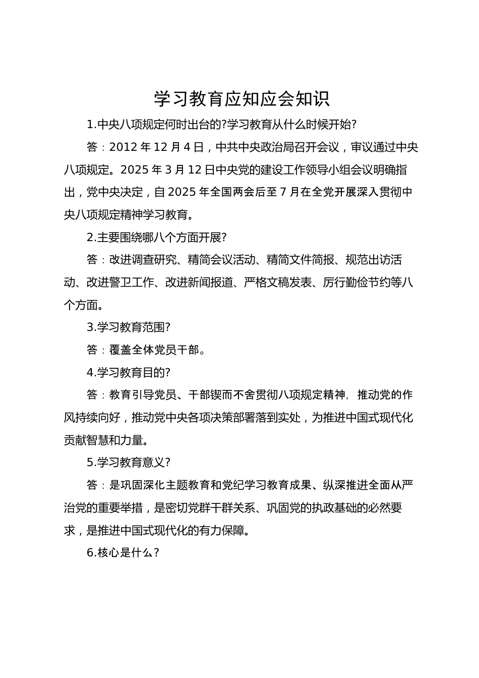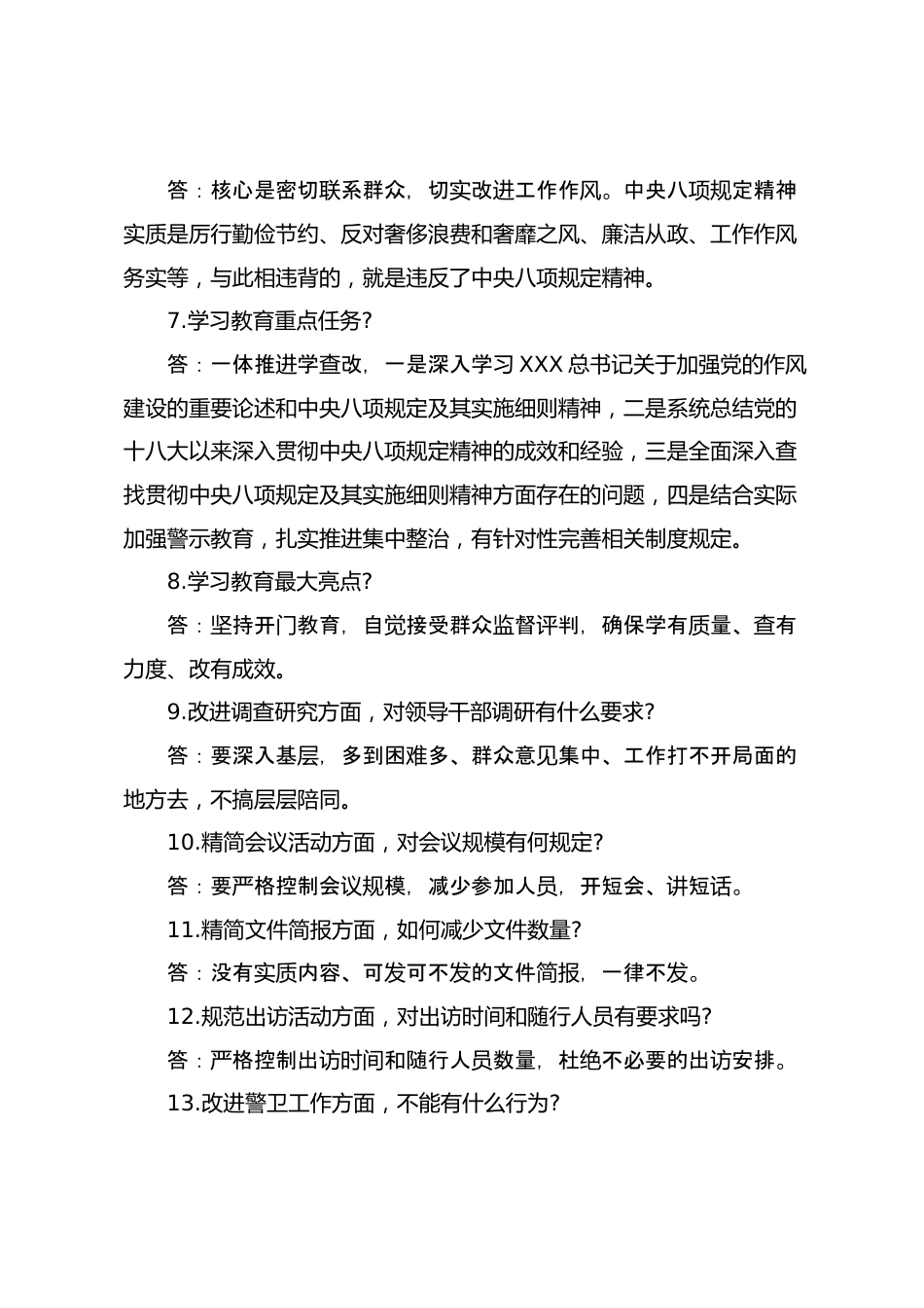 學(xué)習(xí)教育應(yīng)知應(yīng)會知識1.中央八項(xiàng)規(guī)定何時出臺的?學(xué)習(xí)教育從什么時候開始?答:2012年12月4日,中共中央政治局召開會議,審議通過中央八項(xiàng)規(guī)定。2025年3月12日中央黨的建設(shè)工作領(lǐng)導(dǎo)小組會議明確指出,黨中央決定,自2025年全國兩會后至7月在全黨開展深入中貫徹央八項(xiàng)規(guī)定精神學(xué)習(xí)教育。2.主要圍繞哪八個方面開展?答:改進(jìn)調(diào)查研究、精簡會議活動、精簡文件簡報、規(guī)范出訪活動、改進(jìn)警衛(wèi)工作、改進(jìn)新聞報道、嚴(yán)格文稿發(fā)表、厲行勤儉節(jié)約等八個方面。3.學(xué)習(xí)教育范圍?答:覆蓋全體黨干部。員4.學(xué)習(xí)教育目的?答:教育引黨、干部而不舍八定精神,推黨的作導(dǎo)員鍥貫徹項(xiàng)規(guī)動風(fēng)持續(xù)...