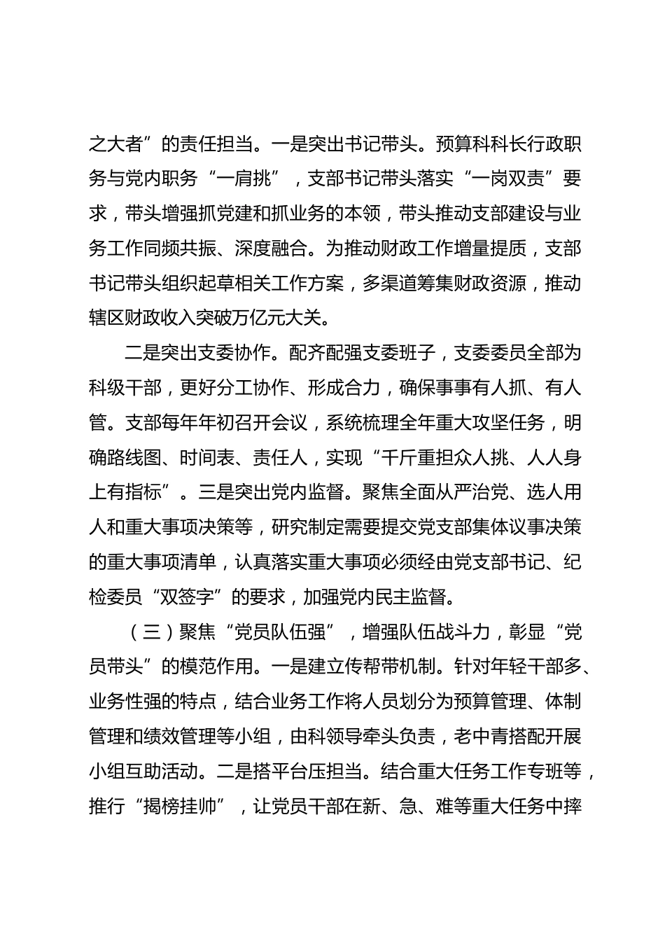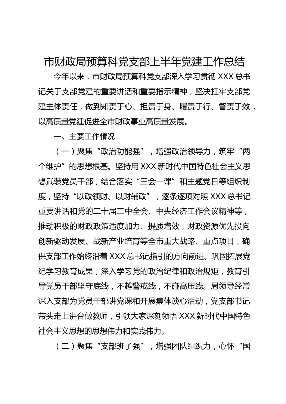 市財政局預(yù)算科黨支部上半年黨建工作總結(jié)今年以來,市財政局預(yù)算科黨支部深入學(xué)習(xí)貫徹XXX總書記關(guān)于支部黨建的重要講話和重要指示精神,堅決扛牢支部黨建主體責(zé)任,做到知責(zé)于心、擔(dān)責(zé)于身、履責(zé)于行、督責(zé)于效,以高質(zhì)量黨建促進全市財政事業(yè)高質(zhì)量發(fā)展。一、主要工作情況(一)聚焦“政治功能強”,增強政治領(lǐng)導(dǎo)力,筑牢“兩個維護”的思想根基。堅持用XXX新時代中國特色社會主義思想武裝黨員干部,結(jié)合落實“三會一課”和主題黨日等組織制度,堅持“以政領(lǐng)財、以財輔政”,逐條逐項對照XXX總書記重要講話和黨的二十屆三中全會、中央經(jīng)濟工作會議精神等,推動積極的財...