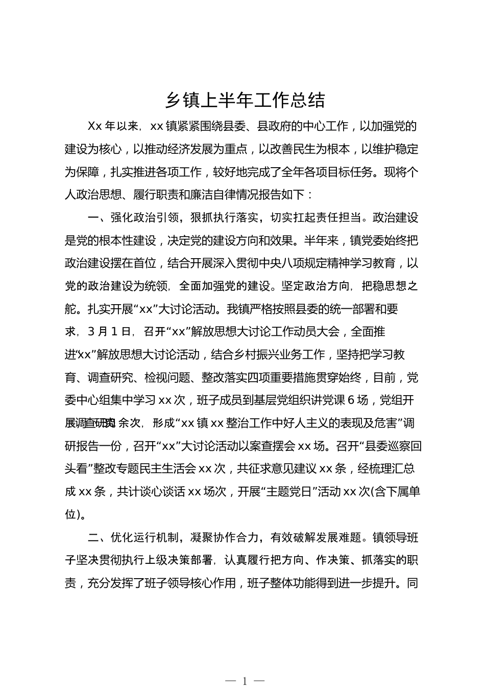 鄉(xiāng)鎮(zhèn)上半年工作總結(jié)Xx年以來(lái),xx鎮(zhèn)緊緊圍繞縣委、縣政府的中心工作,以加強(qiáng)黨的建設(shè)為核心,以推動(dòng)經(jīng)濟(jì)發(fā)展為重點(diǎn),以改善民生為根本,以維護(hù)穩(wěn)定為保障,扎實(shí)推進(jìn)各項(xiàng)工作,較好地完成了全年各項(xiàng)目標(biāo)任務(wù)。現(xiàn)將個(gè)人政治思想、履行職責(zé)和廉潔自律情況報(bào)告如下:一、強(qiáng)化政治引領(lǐng),狠抓執(zhí)行落實(shí),切實(shí)扛起責(zé)任擔(dān)當(dāng)。政治建設(shè)是黨的根本性建設(shè),決定黨的建設(shè)方向和效果。半年來(lái),鎮(zhèn)黨委始終把政治建設(shè)擺在首位,結(jié)合開(kāi)展深入貫徹中央八項(xiàng)規(guī)定精神學(xué)習(xí)教育,以黨的政治建,全面加黨的建。定政治方向,把思想之設(shè)為統(tǒng)領(lǐng)強(qiáng)設(shè)堅(jiān)穩(wěn)“舵。扎實(shí)開(kāi)展xx”大討論活動(dòng)。我鎮(zhèn)嚴(yán)格按照縣...