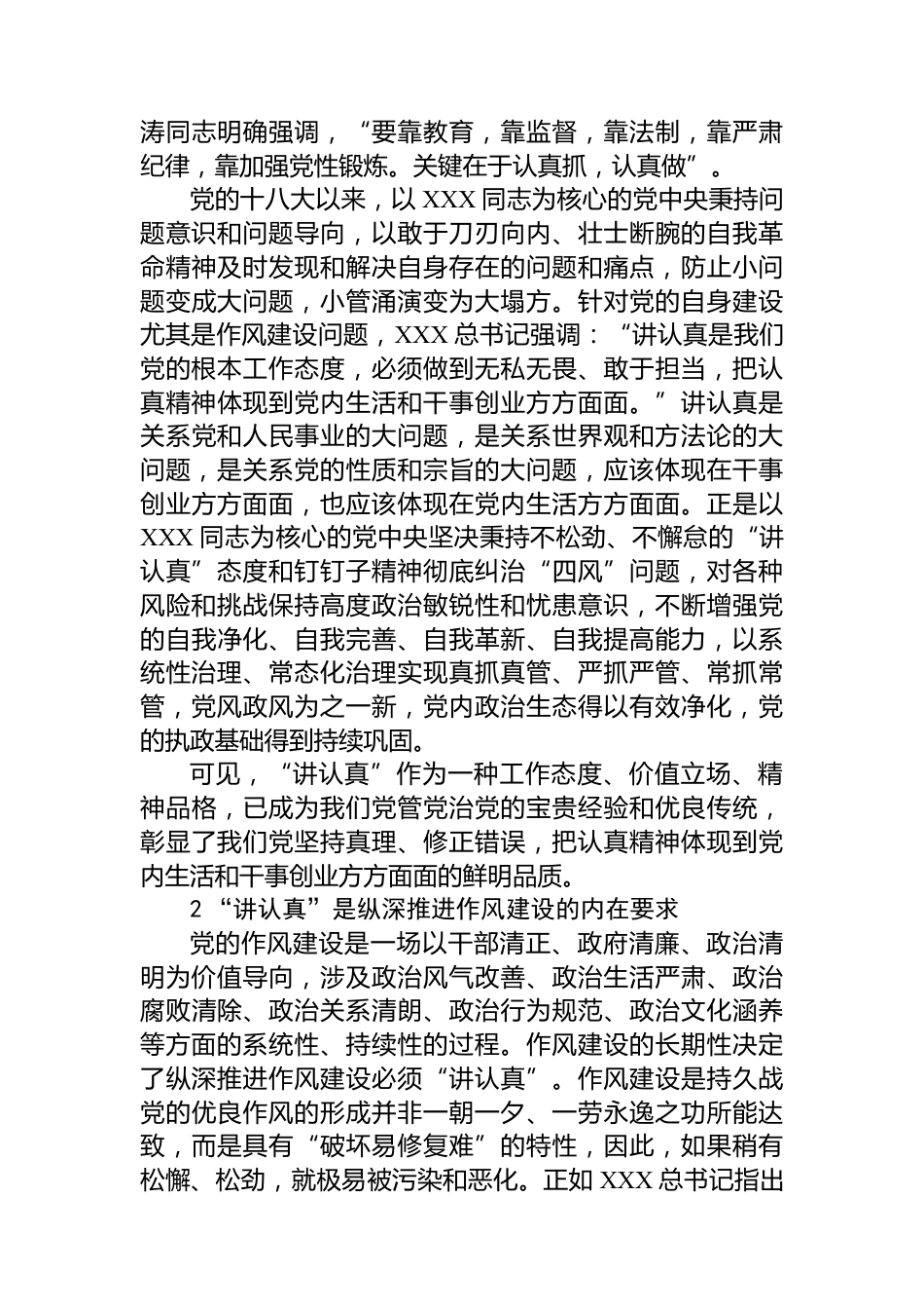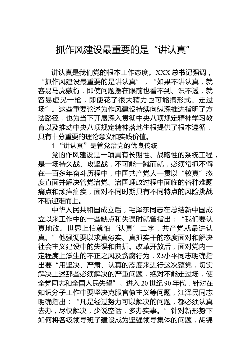 抓作風(fēng)建設(shè)最重要的是“講認(rèn)真”講認(rèn)真是我們黨的根本工作態(tài)度。XXX總書(shū)記強(qiáng)調(diào),“抓作風(fēng)建設(shè)最重要的是講認(rèn)真”,“如果不講認(rèn)真,就容易馬虎敷衍,即使問(wèn)題擺在眼前也看不到、識(shí)不透,就容易虛晃一槍?zhuān)词够撕艽缶σ部赡芨阈问?、走過(guò)場(chǎng)”。這些重要論述為作風(fēng)建設(shè)持續(xù)向縱深推進(jìn)指明了方法路徑,也為當(dāng)下開(kāi)展深入貫徹中央八項(xiàng)規(guī)定精神學(xué)習(xí)教育以及推動(dòng)中央八項(xiàng)規(guī)定精神落地生根提供了根本遵循,具有十分重要的理論意義和實(shí)踐價(jià)值。1“講認(rèn)真”是管黨治黨的優(yōu)良傳統(tǒng)黨的作風(fēng)建設(shè)是一項(xiàng)具有長(zhǎng)期性、戰(zhàn)略性的系統(tǒng)工程,是一場(chǎng)持久戰(zhàn)、攻堅(jiān)戰(zhàn),不可能一蹴而就,必須常...