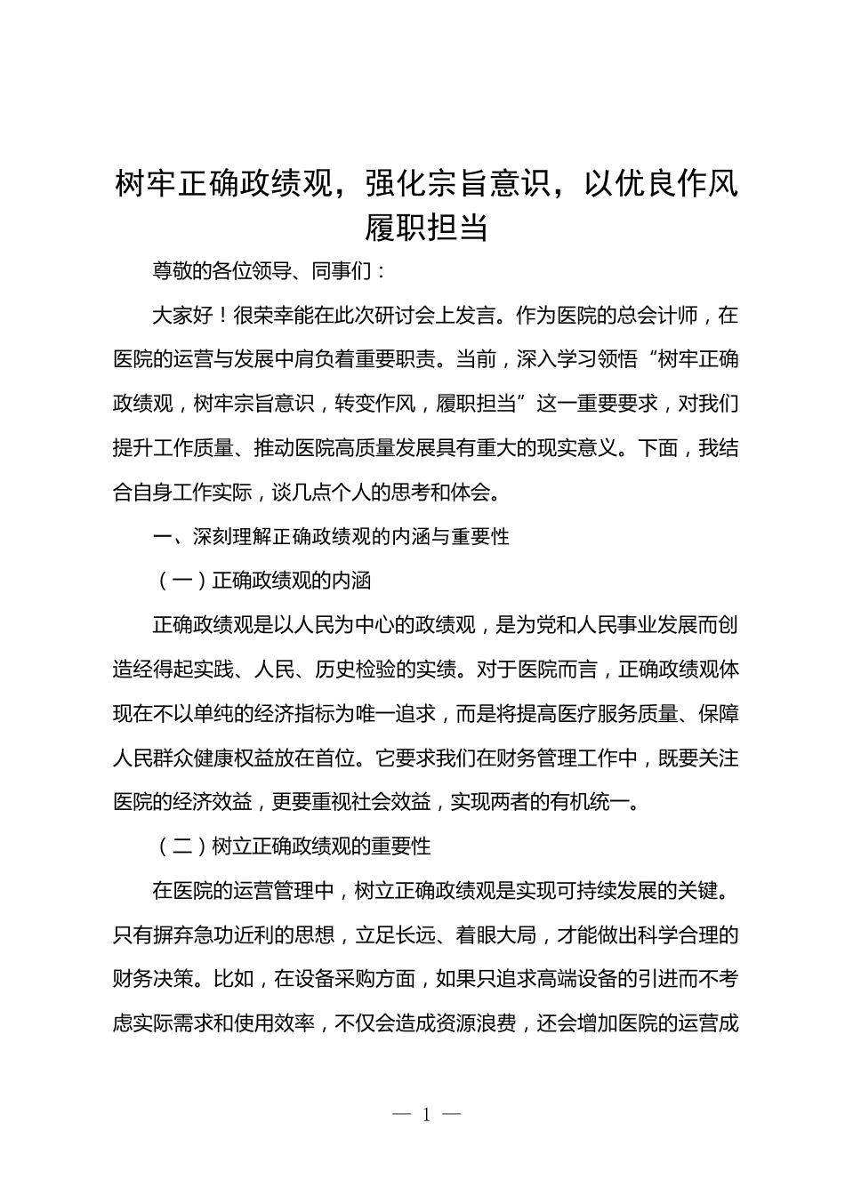 樹牢正確政績(jī)觀,強(qiáng)化宗旨意識(shí),以優(yōu)良作風(fēng)履職擔(dān)當(dāng)尊敬的各位領(lǐng)導(dǎo)、同事們:大家好!很榮幸能在此次研討會(huì)上發(fā)言。作為醫(yī)院的總會(huì)計(jì)師,在醫(yī)院的運(yùn)營(yíng)與發(fā)展中肩負(fù)著重要職責(zé)。當(dāng)前,深入學(xué)習(xí)領(lǐng)悟“樹牢正確政績(jī)觀,樹牢宗旨意識(shí),轉(zhuǎn)變作風(fēng),履職擔(dān)當(dāng)”這一重要要求,對(duì)我們提升工作質(zhì)量、推動(dòng)醫(yī)院高質(zhì)量發(fā)展具有重大的現(xiàn)實(shí)意義。下面,我結(jié)合自身工作實(shí)際,談幾點(diǎn)個(gè)人的思考和體會(huì)。一、深刻理解正確政績(jī)觀的內(nèi)涵與重要性(一)正確政績(jī)觀的內(nèi)涵正確政績(jī)觀是以人民為中心的政績(jī)觀,是為黨和人民事業(yè)發(fā)展而創(chuàng)造經(jīng)得起實(shí)踐、人民、歷史檢驗(yàn)的實(shí)績(jī)。對(duì)于醫(yī)院而言,正確政績(jī)...