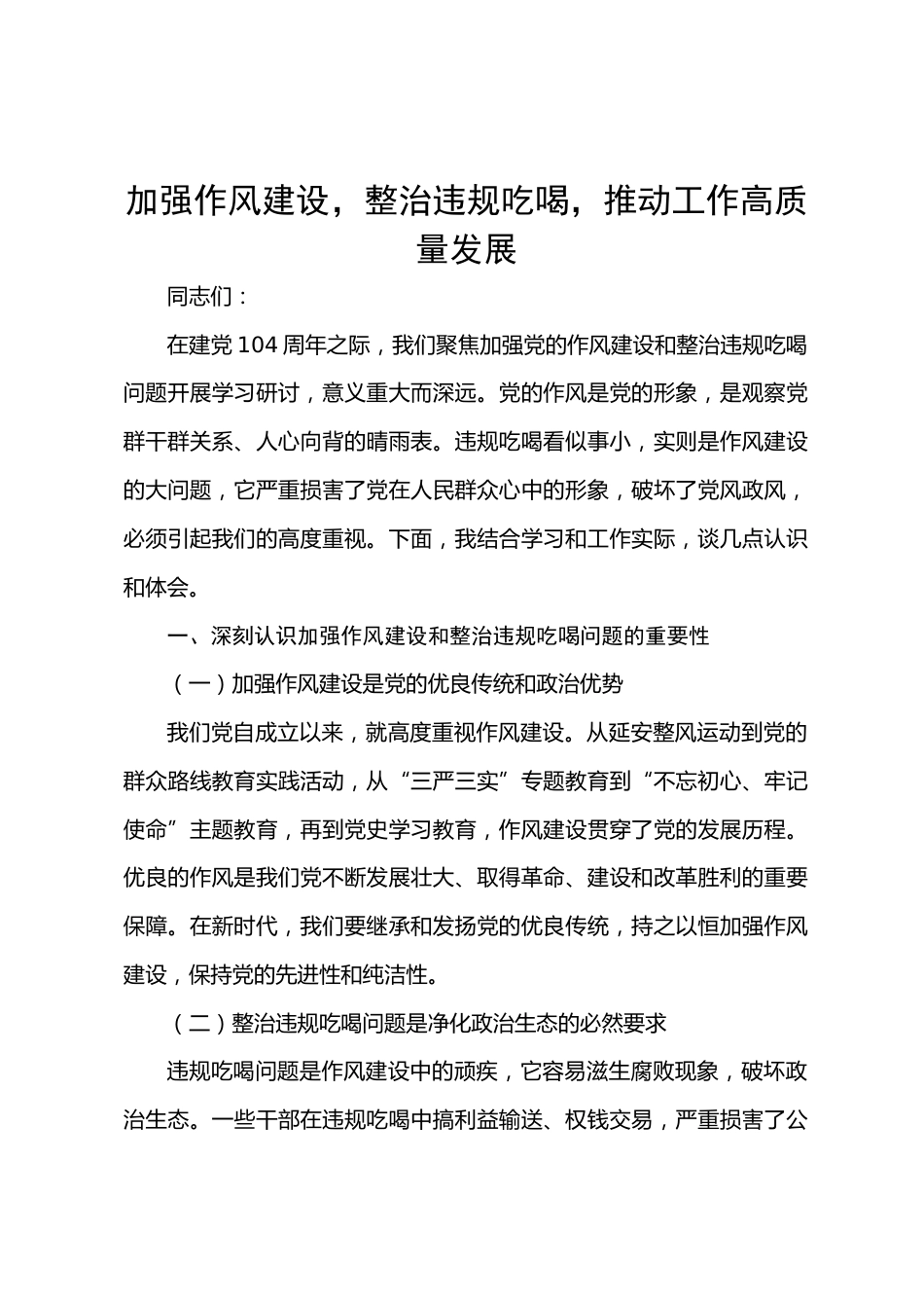加強作風(fēng)建設(shè),整治違規(guī)吃喝,推動工作高質(zhì)量發(fā)展同志們:在建黨104周年之際,我們聚焦加強黨的作風(fēng)建設(shè)和整治違規(guī)吃喝問題開展學(xué)習(xí)研討,意義重大而深遠(yuǎn)。黨的作風(fēng)是黨的形象,是觀察黨群干群關(guān)系、人心向背的晴雨表。違規(guī)吃喝看似事小,實則是作風(fēng)建設(shè)的大問題,它嚴(yán)重?fù)p害了黨在人民群眾心中的形象,破壞了黨風(fēng)政風(fēng),必須引起我們的高度重視。下面,我結(jié)合學(xué)習(xí)和工作實際,談幾點認(rèn)識和體會。一、深刻認(rèn)識加強作風(fēng)建設(shè)和整治違規(guī)吃喝問題的重要性(一)加強作風(fēng)建設(shè)是黨的優(yōu)良傳統(tǒng)和政治優(yōu)勢我們黨自成立以來,就高度重視作風(fēng)建設(shè)。從延安整風(fēng)運動到黨的群眾路線教育...