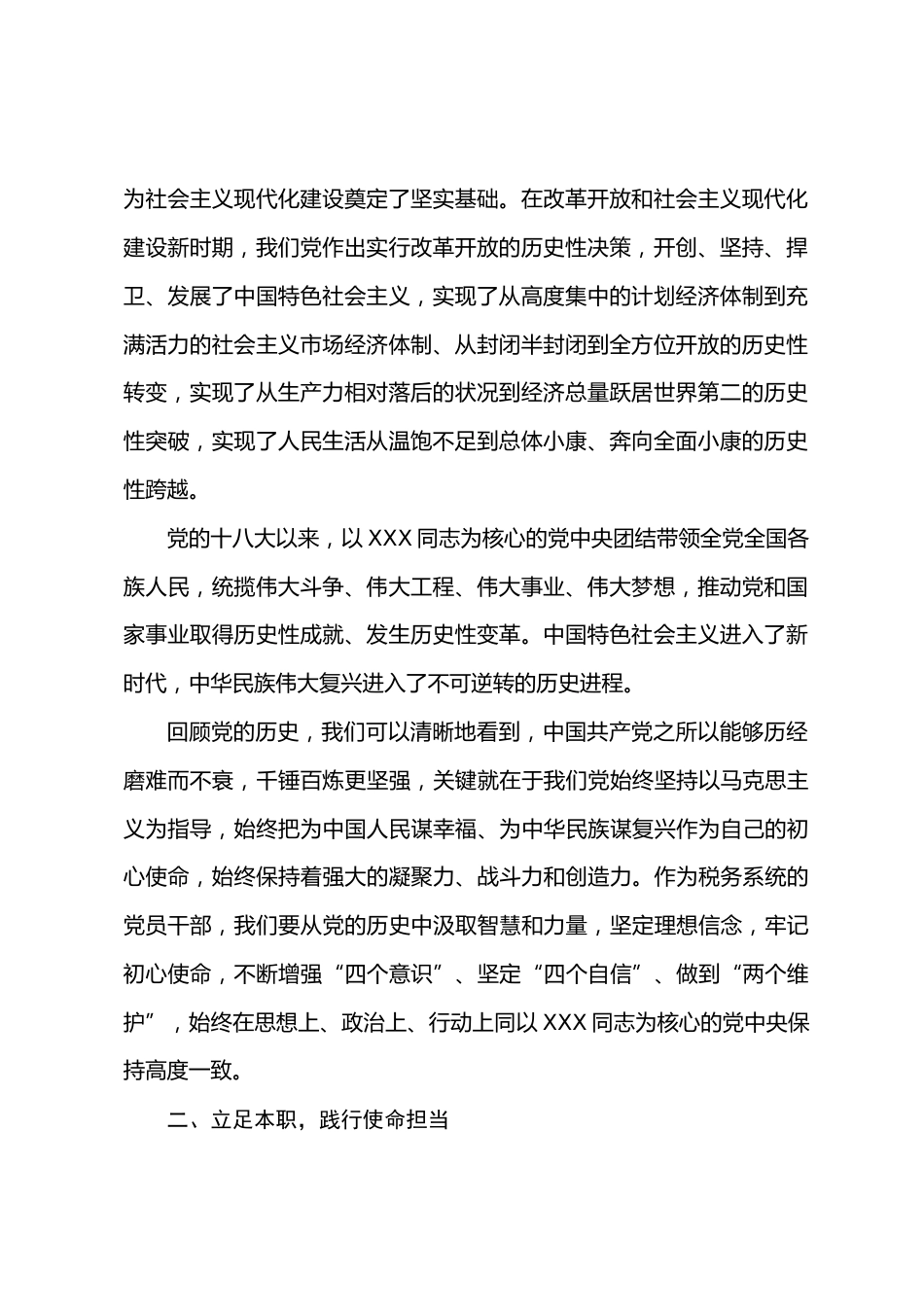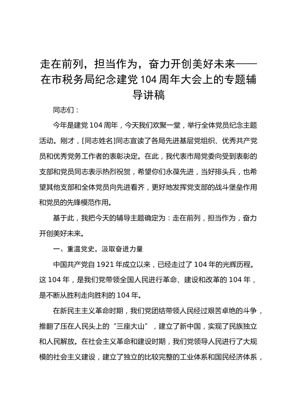 走在前列,擔(dān)當作為,奮力開創(chuàng)美好未來——在市稅務(wù)局紀念建黨104周年大會上的專題輔導(dǎo)講稿同志們:今年是建黨104周年,今天我們歡聚一堂,舉行全體黨員紀念主題活動。剛才,[同志姓名]同志宣讀了各局先進基層黨組織、優(yōu)秀共產(chǎn)黨員和優(yōu)秀黨務(wù)工作者的表彰決定。在此,我代表市局黨委向受到表彰的支部和黨員同志表示熱烈祝賀,希望你們永葆先進,當好排頭兵,也希望其他支部和全體黨員向先進看齊,更好地發(fā)揮黨支部的戰(zhàn)斗堡壘作用和黨員的先鋒模范作用。基于此,我把今天的輔導(dǎo)主題確定為:走在前列,擔(dān)當作為,奮力開創(chuàng)美好未來。一、重溫黨史,汲取奮進力量中國共產(chǎn)黨自...