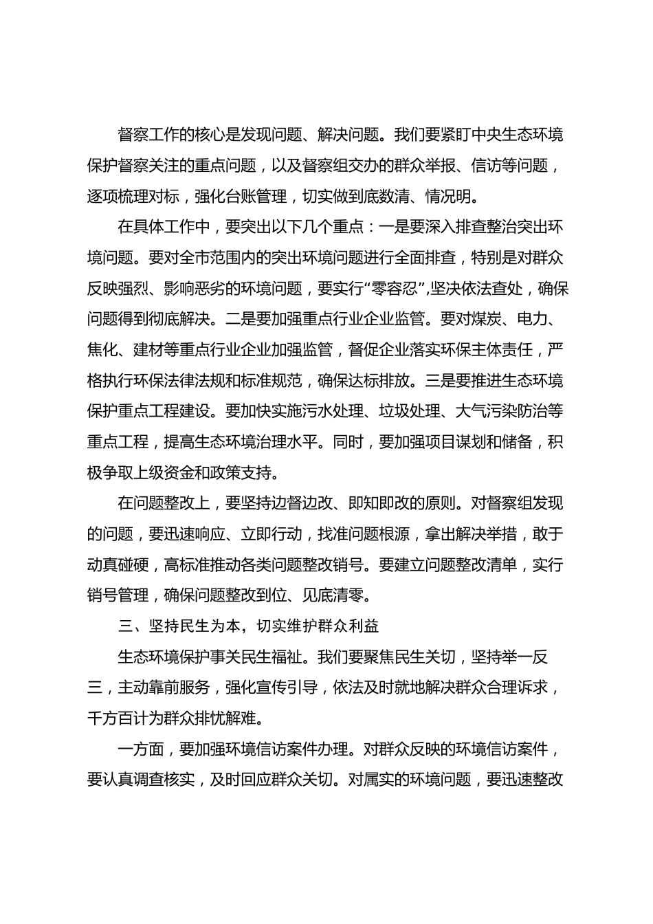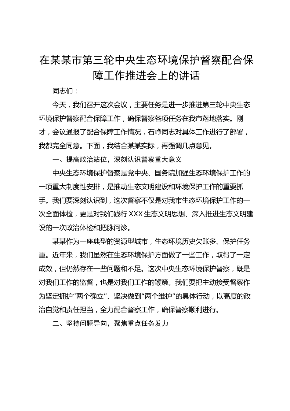 在某某市第三輪中央生態(tài)環(huán)境保護(hù)督察配合保障工作推進(jìn)會上的講話同志們:今天,我們召開這次會議,主要任務(wù)是進(jìn)一步推進(jìn)第三輪中央生態(tài)環(huán)境保護(hù)督察配合保障工作,確保督察各項(xiàng)任務(wù)在我市落地落實(shí)。剛才,會議通報(bào)了配合保障工作情況,石崢同志對具體工作進(jìn)行了部署,我都完全同意。下面,我結(jié)合某某實(shí)際,再強(qiáng)調(diào)幾點(diǎn)意見。一、提高政治站位,深刻認(rèn)識督察重大意義中央生態(tài)環(huán)境保護(hù)督察是黨中央、國務(wù)院加強(qiáng)生態(tài)環(huán)境保護(hù)工作的一項(xiàng)重大制度性安排,是推動生態(tài)文明建設(shè)和環(huán)境保護(hù)工作的重要抓手。我們要深刻認(rèn)識到,這次督察不僅是對我市生態(tài)環(huán)境保護(hù)工作的一次全面體檢,...