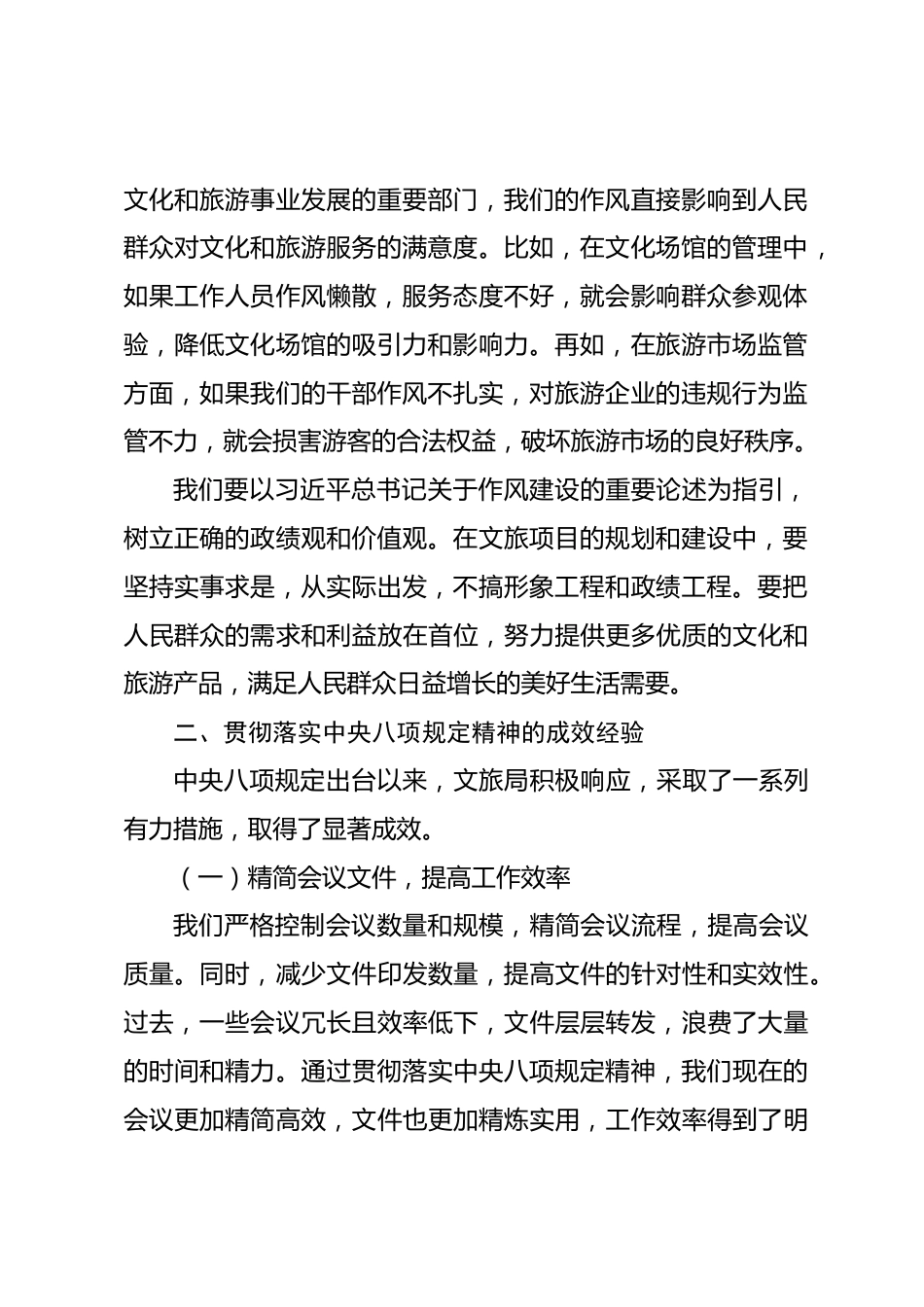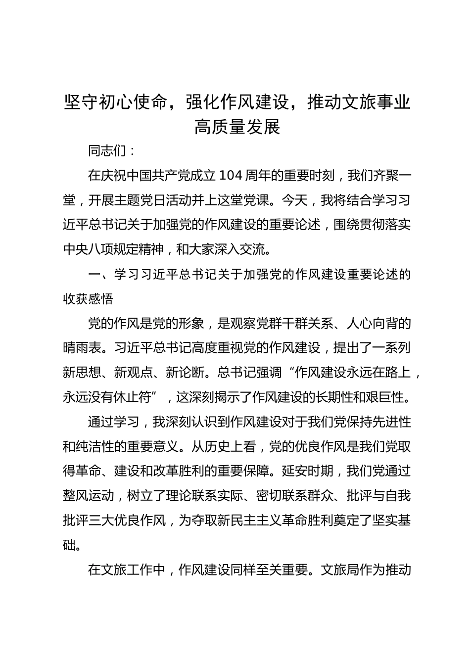 堅(jiān)守初心使命,強(qiáng)化作風(fēng)建設(shè),推動文旅事業(yè)高質(zhì)量發(fā)展同志們:在慶祝中國共產(chǎn)黨成立104周年的重要時刻,我們齊聚一堂,開展主題黨日活動并上這堂黨課。今天,我將結(jié)合學(xué)習(xí)習(xí)近平總書記關(guān)于加強(qiáng)黨的作風(fēng)建設(shè)的重要論述,圍繞貫徹落實(shí)中央八項(xiàng)規(guī)定精神,和大家深入交流。一、學(xué)習(xí)習(xí)近平總書記關(guān)于加強(qiáng)黨的作風(fēng)建設(shè)重要論述的收獲感悟黨的作風(fēng)是黨的形象,是觀察黨群干群關(guān)系、人心向背的晴雨表。習(xí)近平總書記高度重視黨的作風(fēng)建設(shè),提出了一系列新思想、新觀點(diǎn)、新論斷??倳洀?qiáng)調(diào)“作風(fēng)建設(shè)永遠(yuǎn)在路上,永遠(yuǎn)沒有休止符”,這深刻揭示了作風(fēng)建設(shè)的長期性和艱巨性。通過學(xué)...