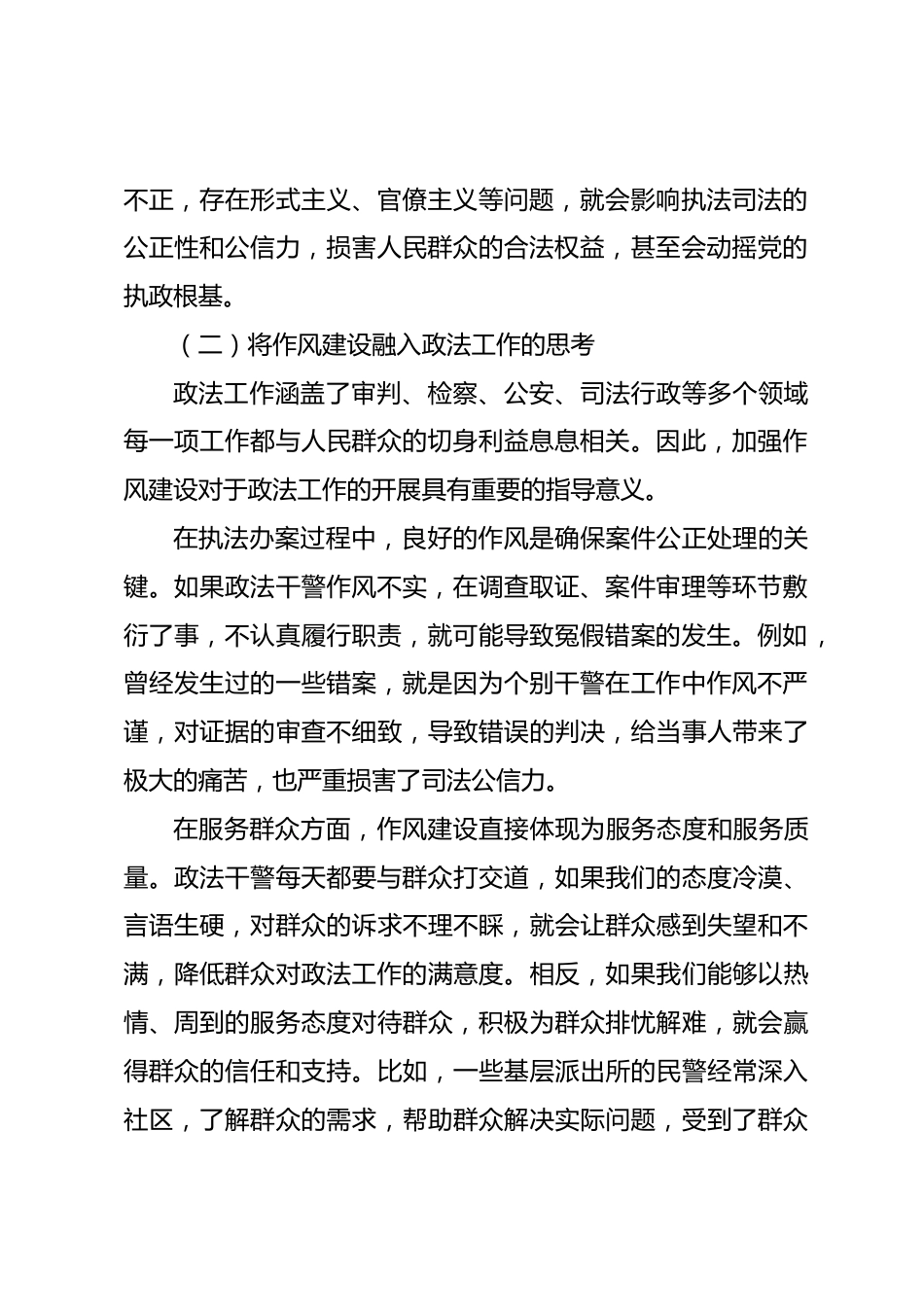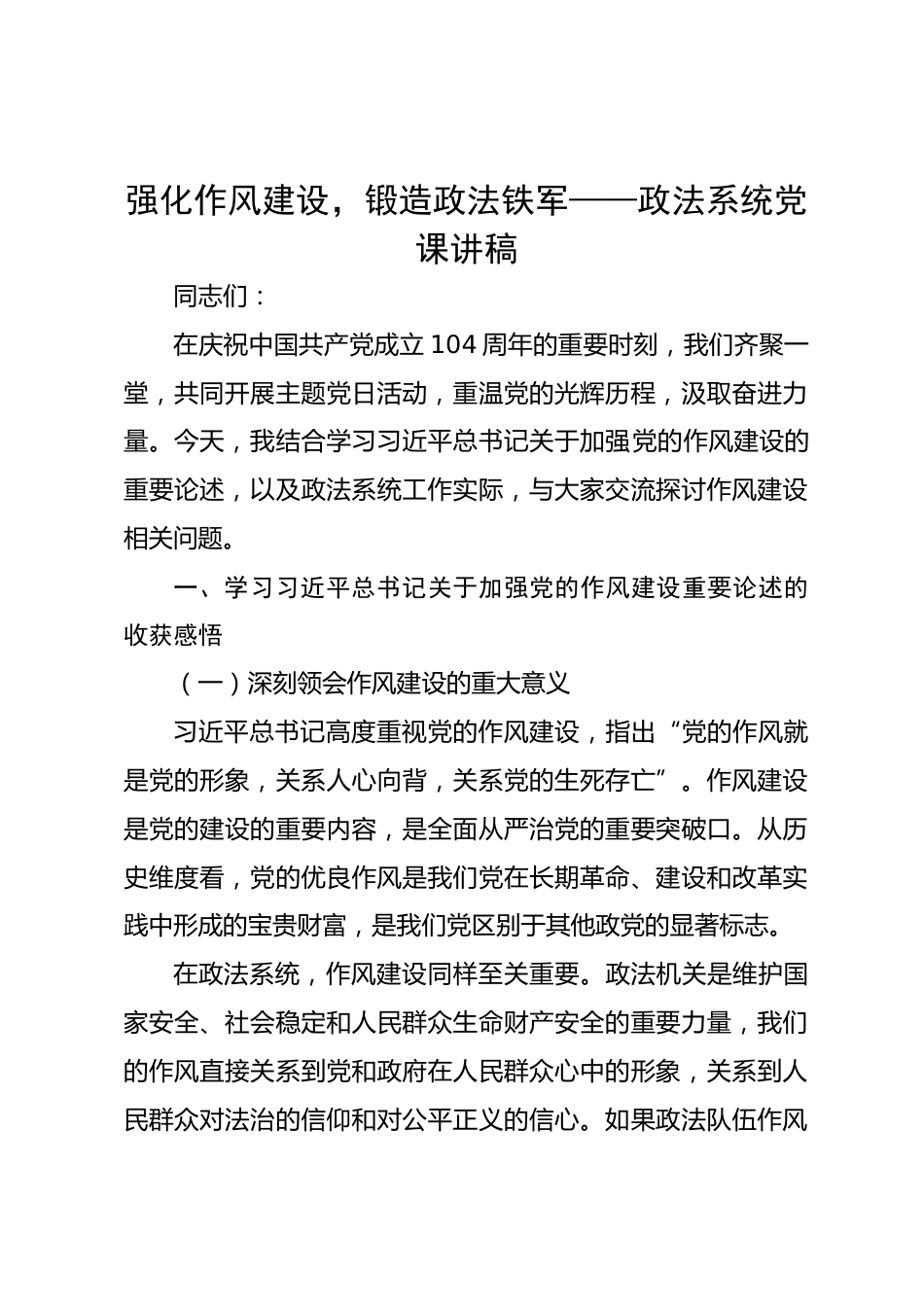 強(qiáng)化作風(fēng)建設(shè),鍛造政法鐵軍——政法系統(tǒng)黨課講稿同志們:在慶祝中國共產(chǎn)黨成立104周年的重要時刻,我們齊聚一堂,共同開展主題黨日活動,重溫黨的光輝歷程,汲取奮進(jìn)力量。今天,我結(jié)合學(xué)習(xí)習(xí)近平總書記關(guān)于加強(qiáng)黨的作風(fēng)建設(shè)的重要論述,以及政法系統(tǒng)工作實(shí)際,與大家交流探討作風(fēng)建設(shè)相關(guān)問題。一、學(xué)習(xí)習(xí)近平總書記關(guān)于加強(qiáng)黨的作風(fēng)建設(shè)重要論述的收獲感悟(一)深刻領(lǐng)會作風(fēng)建設(shè)的重大意義習(xí)近平總書記高度重視黨的作風(fēng)建設(shè),指出“黨的作風(fēng)就是黨的形象,關(guān)系人心向背,關(guān)系黨的生死存亡”。作風(fēng)建設(shè)是黨的建設(shè)的重要內(nèi)容,是全面從嚴(yán)治黨的重要突破口。從歷史維度...