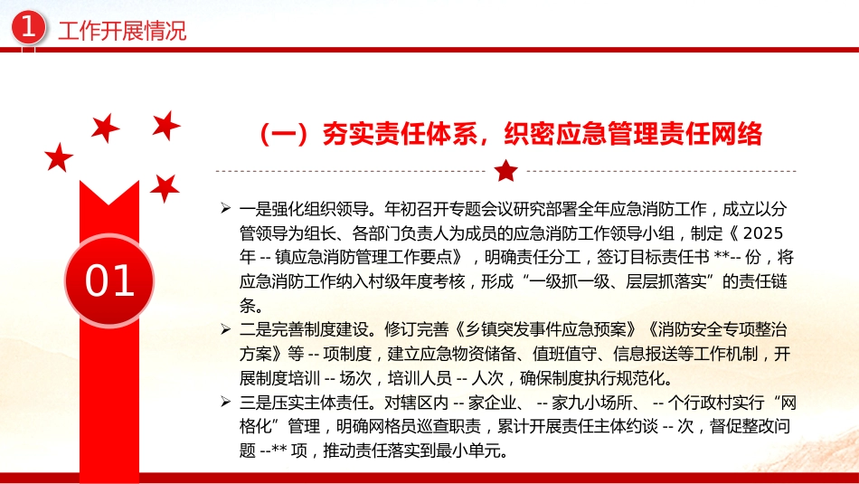 應(yīng)急消防管理辦公室2025年上半年工作情況報告授課人:某某某時間:2025.06.20第一部分PARTONE工作開展情況工作開展情況101(一)夯實(shí)責(zé)任體系,織密應(yīng)急管理責(zé)任網(wǎng)絡(luò)?一是強(qiáng)化組織領(lǐng)導(dǎo)。年初召開專題會議研究部署全年應(yīng)急消防工作,成立以分管領(lǐng)導(dǎo)為組長、各部門負(fù)責(zé)人為成員的應(yīng)急消防工作領(lǐng)導(dǎo)小組,制定《2025年--鎮(zhèn)應(yīng)急消防管理工作要點(diǎn)》,明確責(zé)任分工,簽訂目標(biāo)責(zé)任書**--份,將應(yīng)急消防工作納入村級年度考核,形成“一級抓一級、層層抓落實(shí)”的責(zé)任鏈條。?二是完善制度建設(shè)。修訂完善《鄉(xiāng)鎮(zhèn)突發(fā)事件應(yīng)急預(yù)案》《消防安全專項整治方案》等--項制度,建立應(yīng)急物資...