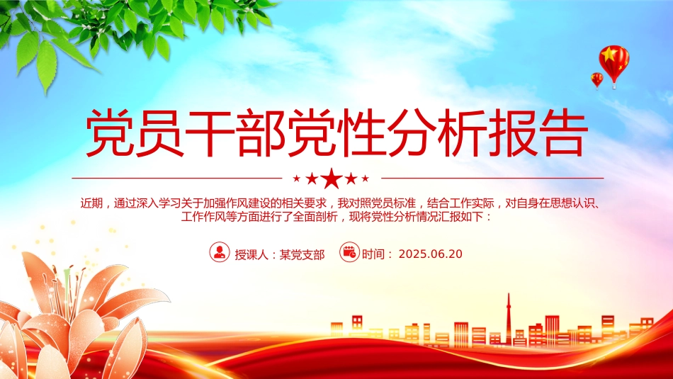 感謝您下載包圖網(wǎng)平臺上提供的PPT作品,為了您和包圖網(wǎng)以及原創(chuàng)作者的利益,請勿復(fù)制、傳播、銷售,否則將承擔(dān)法律責(zé)任!包圖網(wǎng)將對作品進(jìn)行維權(quán),按照傳播下載次數(shù)進(jìn)行十倍的索取賠償!ibaotu.com黨員干部黨性分析報告授課人:某黨支部時間:2025.06.20近期,通過深入學(xué)習(xí)關(guān)于加強(qiáng)作風(fēng)建設(shè)的相關(guān)要求,我對照黨員標(biāo)準(zhǔn),結(jié)合工作實(shí)際,對自身在思想認(rèn)識、工作作風(fēng)等方面進(jìn)行了全面剖析,現(xiàn)將黨性分析情況匯報如下:感謝您下載包圖網(wǎng)平臺上提供的PPT作品,為了您和包圖網(wǎng)以及原創(chuàng)作者的利益,請勿復(fù)制、傳播、銷售,否則將承擔(dān)法律責(zé)任!包圖網(wǎng)將對作品進(jìn)行維權(quán),按照傳播...