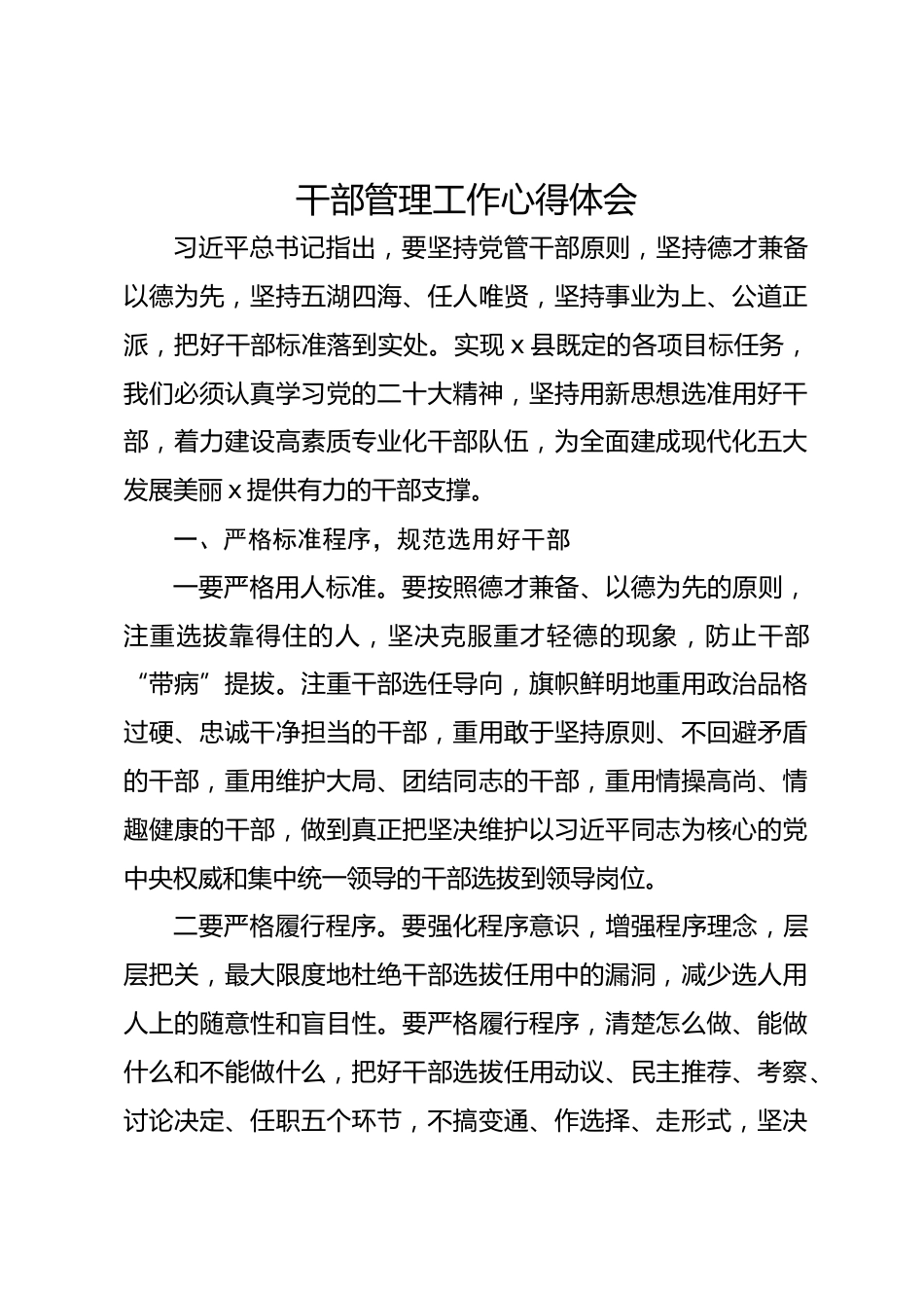 干部管理工作心得體會(huì)習(xí)近平總書(shū)記指出,要堅(jiān)持黨管干部原則,堅(jiān)持德才兼?zhèn)湟缘聻橄?,?jiān)持五湖四海、任人唯賢,堅(jiān)持事業(yè)為上、公道正派,把好干部標(biāo)準(zhǔn)落到實(shí)處。實(shí)現(xiàn)x縣既定的各項(xiàng)目標(biāo)任務(wù),我們必須認(rèn)真學(xué)習(xí)黨的二十大精神,堅(jiān)持用新思想選準(zhǔn)用好干部,著力建設(shè)高素質(zhì)專(zhuān)業(yè)化干部隊(duì)伍,為全面建成現(xiàn)代化五大發(fā)展美麗x提供有力的干部支撐。一、嚴(yán)格標(biāo)準(zhǔn)程序,規(guī)范選用好干部一要嚴(yán)格用人標(biāo)準(zhǔn)。要按照德才兼?zhèn)?、以德為先的原則,注重選拔靠得住的人,堅(jiān)決克服重才輕德的現(xiàn)象,防止干部“帶病”提拔。注重干部選任導(dǎo)向,旗幟鮮明地重用政治品格過(guò)硬、忠誠(chéng)干凈擔(dān)當(dāng)?shù)母刹?,?..