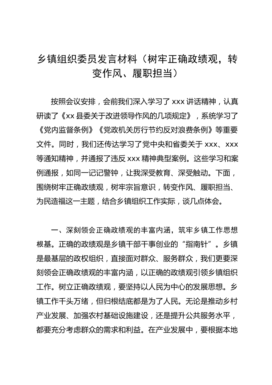 鄉(xiāng)鎮(zhèn)組織委員發(fā)言材料(樹牢正確政績觀,轉(zhuǎn)變作風(fēng)、履職擔(dān)當(dāng))VIP免費