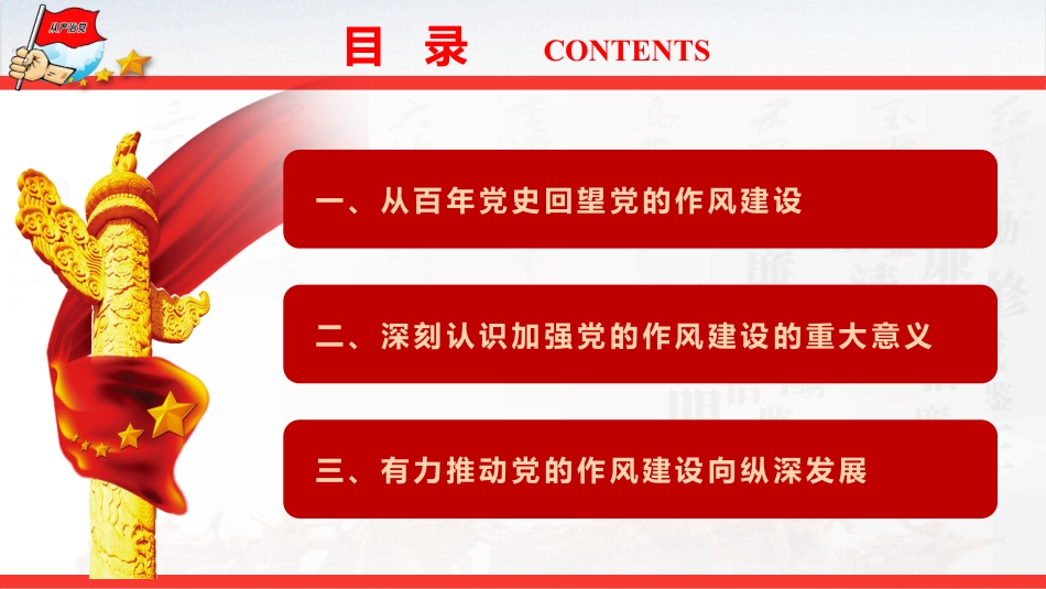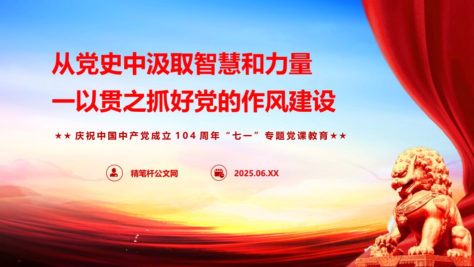 從黨史中汲取智慧和力量一以貫之抓好黨的作風(fēng)建設(shè)精筆桿公文網(wǎng)2025.06.XX★★慶祝中國中產(chǎn)黨成立104周年“七一”專題黨課教育★★前言導(dǎo)讀作風(fēng)就是形象,作風(fēng)就是力量。習(xí)近平總書記指出:“我們黨團(tuán)結(jié)帶領(lǐng)人民取得了革命、建設(shè)、改革的偉大成就,很重要的一條就是我們黨在長期實(shí)踐中培育并堅(jiān)持了一整套光榮傳統(tǒng)和優(yōu)良作風(fēng)”。這啟示我們,要貫通歷史、現(xiàn)實(shí)與未來,深刻認(rèn)識(shí)加強(qiáng)黨的作風(fēng)建設(shè)的極端重要性,進(jìn)一步增強(qiáng)在新征程上深入推進(jìn)黨的作風(fēng)建設(shè)的政治自覺、思想自覺、行動(dòng)自覺,為以中國式現(xiàn)代化全面推進(jìn)強(qiáng)國建設(shè)、民族復(fù)興偉業(yè)提供堅(jiān)強(qiáng)作風(fēng)保證。目錄CONTENTS二、...