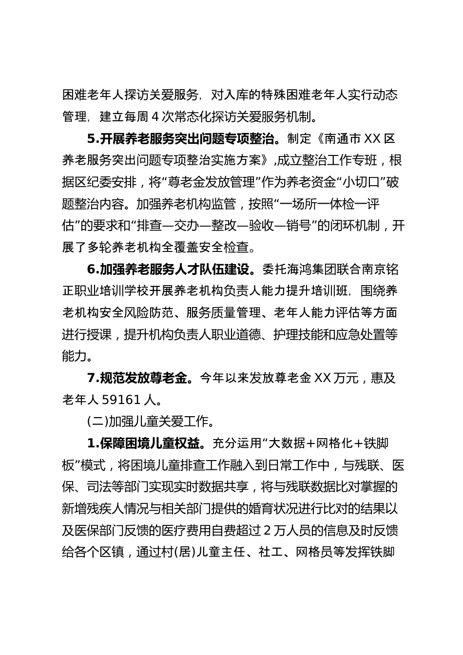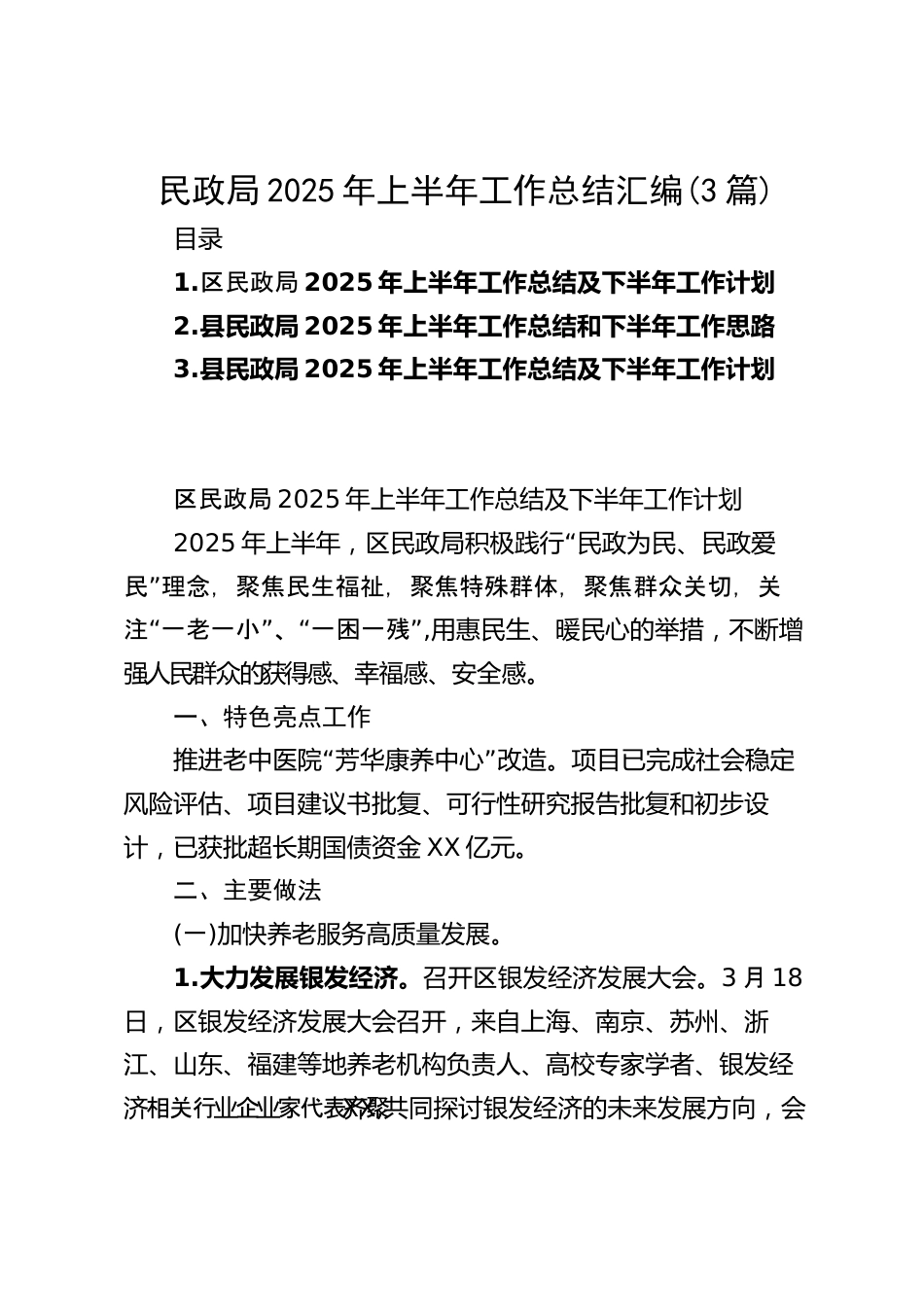 民政局2025年上半年工作總結(jié)匯編(3篇)目錄1.區(qū)民政局2025年上半年工作總結(jié)及下半年工作計劃2.縣民政局2025年上半年工作總結(jié)和下半年工作思路3.縣民政局2025年上半年工作總結(jié)及下半年工作計劃區(qū)民政局2025年上半年工作總結(jié)及下半年工作計劃2025“年上半年,區(qū)民政局積極踐行民政為民、民政愛”民理念,聚焦民生福祉,聚焦特殊群體,聚焦群眾關(guān)切,關(guān)“”“”注一老一小、一困一殘,用惠民生、暖民心的舉措,不斷增強人民群眾的獲得感、幸福感、安全感。一、特色亮點工作“”推進老中醫(yī)院芳華康養(yǎng)中心改造。項目已完成社會穩(wěn)定風(fēng)險評估、項目建議書批復(fù)、可行性研究報告批復(fù)...