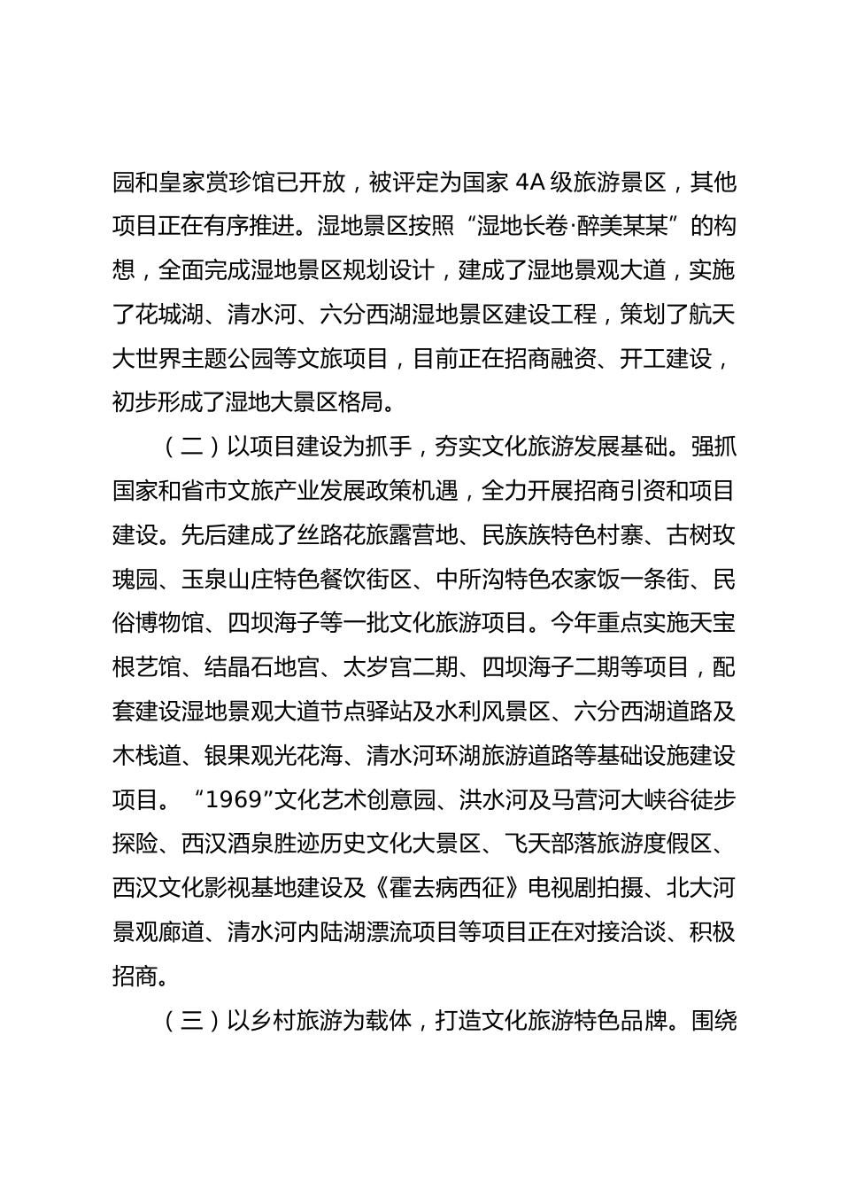 某縣文化旅游產(chǎn)業(yè)發(fā)展情況報告根據(jù)會議安排,下面,我代表縣政府報告全區(qū)文化旅游產(chǎn)業(yè)發(fā)展情況,請予審議。一、發(fā)展現(xiàn)狀近年來,我縣聚焦市委“八個走前列”部署要求,緊緊圍繞建設(shè)文化旅游特色城市目標(biāo)定位,堅持“文化引領(lǐng)、旅游帶動、產(chǎn)業(yè)融合”發(fā)展理念,按照全域旅游發(fā)展規(guī)劃布局,主攻文化旅游項目,打造核心旅游景區(qū),培育文化旅游產(chǎn)品,大力發(fā)展鄉(xiāng)村旅游,加快構(gòu)建公共文化服務(wù)體系,推動文化旅游產(chǎn)業(yè)高質(zhì)量發(fā)展。截止目前,全區(qū)有國家A級旅游景區(qū)11家,有旅行社29家、服務(wù)網(wǎng)點30余家,星級賓館20家,鄉(xiāng)村旅游接待點300多家,星級農(nóng)家樂80余家,“三館一站”實現(xiàn)...