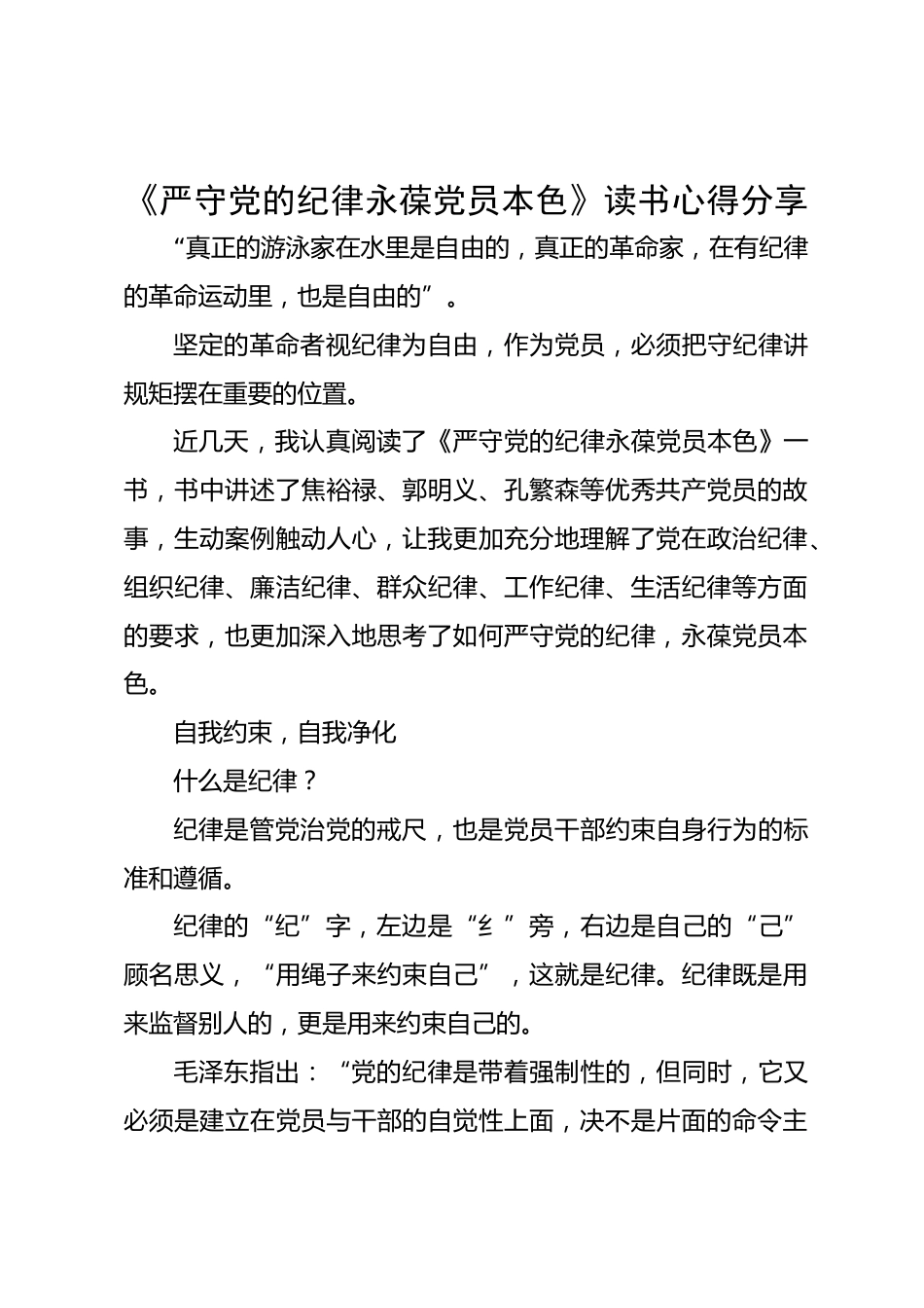 《嚴(yán)守黨的紀(jì)律永葆黨員本色》讀書心得分享“真正的游泳家在水里是自由的,真正的革命家,在有紀(jì)律的革命運(yùn)動(dòng)里,也是自由的”。堅(jiān)定的革命者視紀(jì)律為自由,作為黨員,必須把守紀(jì)律講規(guī)矩?cái)[在重要的位置。近幾天,我認(rèn)真閱讀了《嚴(yán)守黨的紀(jì)律永葆黨員本色》一書,書中講述了焦裕祿、郭明義、孔繁森等優(yōu)秀共產(chǎn)黨員的故事,生動(dòng)案例觸動(dòng)人心,讓我更加充分地理解了黨在政治紀(jì)律、組織紀(jì)律、廉潔紀(jì)律、群眾紀(jì)律、工作紀(jì)律、生活紀(jì)律等方面的要求,也更加深入地思考了如何嚴(yán)守黨的紀(jì)律,永葆黨員本色。自我約束,自我凈化什么是紀(jì)律?紀(jì)律是管黨治黨的戒尺,也是黨員干部約束...