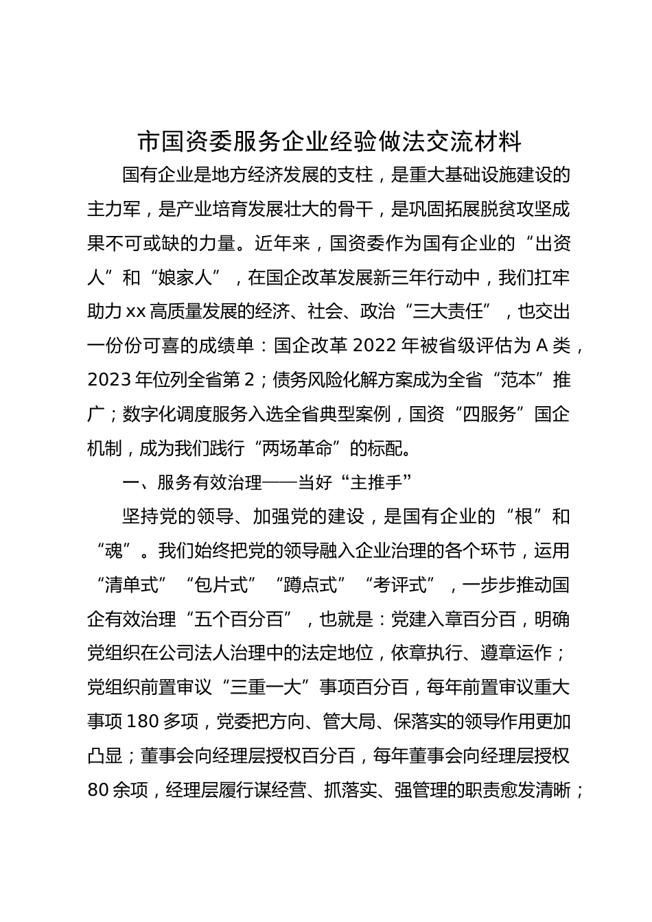 市國資委服務企業(yè)經驗做法交流材料國有企業(yè)是地方經濟發(fā)展的支柱,是重大基礎設施建設的主力軍,是產業(yè)培育發(fā)展壯大的骨干,是鞏固拓展脫貧攻堅成果不可或缺的力量。近年來,國資委作為國有企業(yè)的“出資人”和“娘家人”,在國企改革發(fā)展新三年行動中,我們扛牢助力xx高質量發(fā)展的經濟、社會、政治“三大責任”,也交出一份份可喜的成績單:國企改革2022年被省級評估為A類,2023年位列全省第2;債務風險化解方案成為全省“范本”推廣;數(shù)字化調度服務入選全省典型案例,國資“四服務”國企機制,成為我們踐行“兩場革命”的標配。一、服務有效治理——當好“主推手”堅持...
