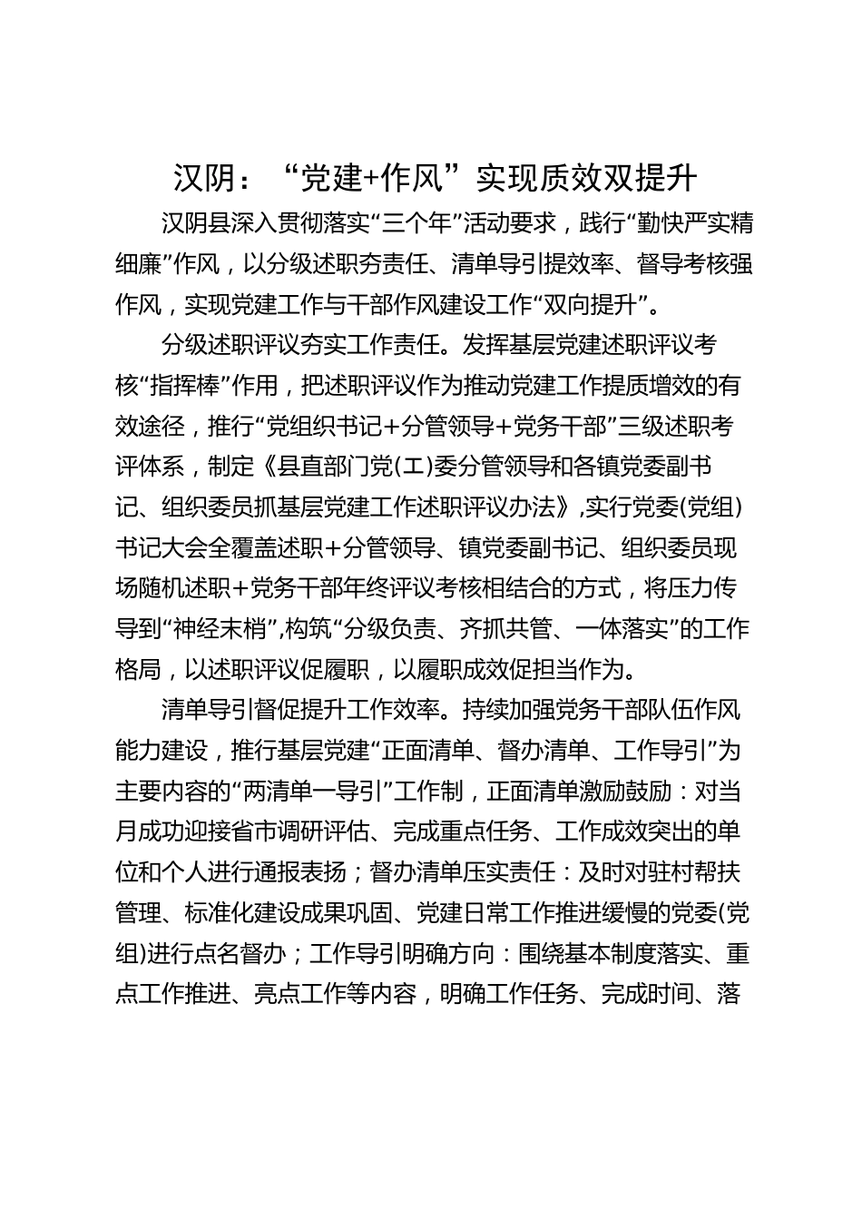 漢陰:“黨建+作風(fēng)”實(shí)現(xiàn)質(zhì)效雙提升“”“漢陰縣深入貫徹落實(shí)三個(gè)年活動(dòng)要求,踐行勤快嚴(yán)實(shí)精”細(xì)廉作風(fēng),以分級(jí)述職夯責(zé)任、清單導(dǎo)引提效率、督導(dǎo)考核強(qiáng)“”作風(fēng),實(shí)現(xiàn)黨建工作與干部作風(fēng)建設(shè)工作雙向提升。分級(jí)述職評(píng)議夯實(shí)工作責(zé)任。發(fā)揮基層黨建述職評(píng)議考“”核指揮棒作用,把述職評(píng)議作為推動(dòng)黨建工作提質(zhì)增效的有“效途徑,推行黨組織書記+分管領(lǐng)導(dǎo)+”黨務(wù)干部三級(jí)述職考評(píng)體系,制定《縣直部門黨(工)委分管領(lǐng)導(dǎo)和各鎮(zhèn)黨委副書記、組織委員抓基層黨建工作述職評(píng)議辦法》,實(shí)行黨委(黨組)書記大會(huì)全覆蓋述職+分管領(lǐng)導(dǎo)、鎮(zhèn)黨委副書記、組織委員現(xiàn)場(chǎng)隨機(jī)述職+黨務(wù)干部...