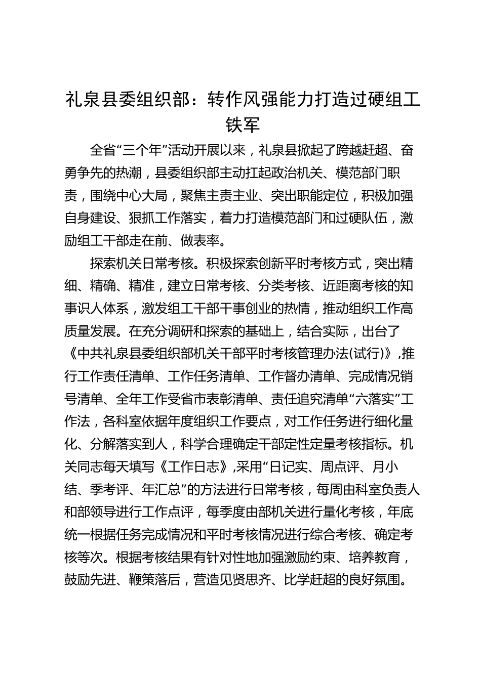 禮泉縣委組織部:轉(zhuǎn)作風(fēng)強(qiáng)能力打造過硬組工鐵軍“”全省三個年活動開展以來,禮泉縣掀起了跨越趕超、奮勇爭先的熱潮,縣委組織部主動扛起政治機(jī)關(guān)、模范部門職責(zé),圍繞中心大局,聚焦主責(zé)主業(yè)、突出職能定位,積極加強(qiáng)自身建設(shè)、狠抓工作落實,著力打造模范部門和過硬隊伍,激勵組工干部走在前、做表率。探索機(jī)關(guān)日??己恕7e極探索創(chuàng)新平時考核方式,突出精細(xì)、精確、精準(zhǔn),建立日??己?、分類考核、近距離考核的知事識人體系,激發(fā)組工干部干事創(chuàng)業(yè)的熱情,推動組織工作高質(zhì)量發(fā)展。在充分調(diào)研和探索的基礎(chǔ)上,結(jié)合實際,出臺了《中共禮泉縣委組織部機(jī)關(guān)干部平時考核管...