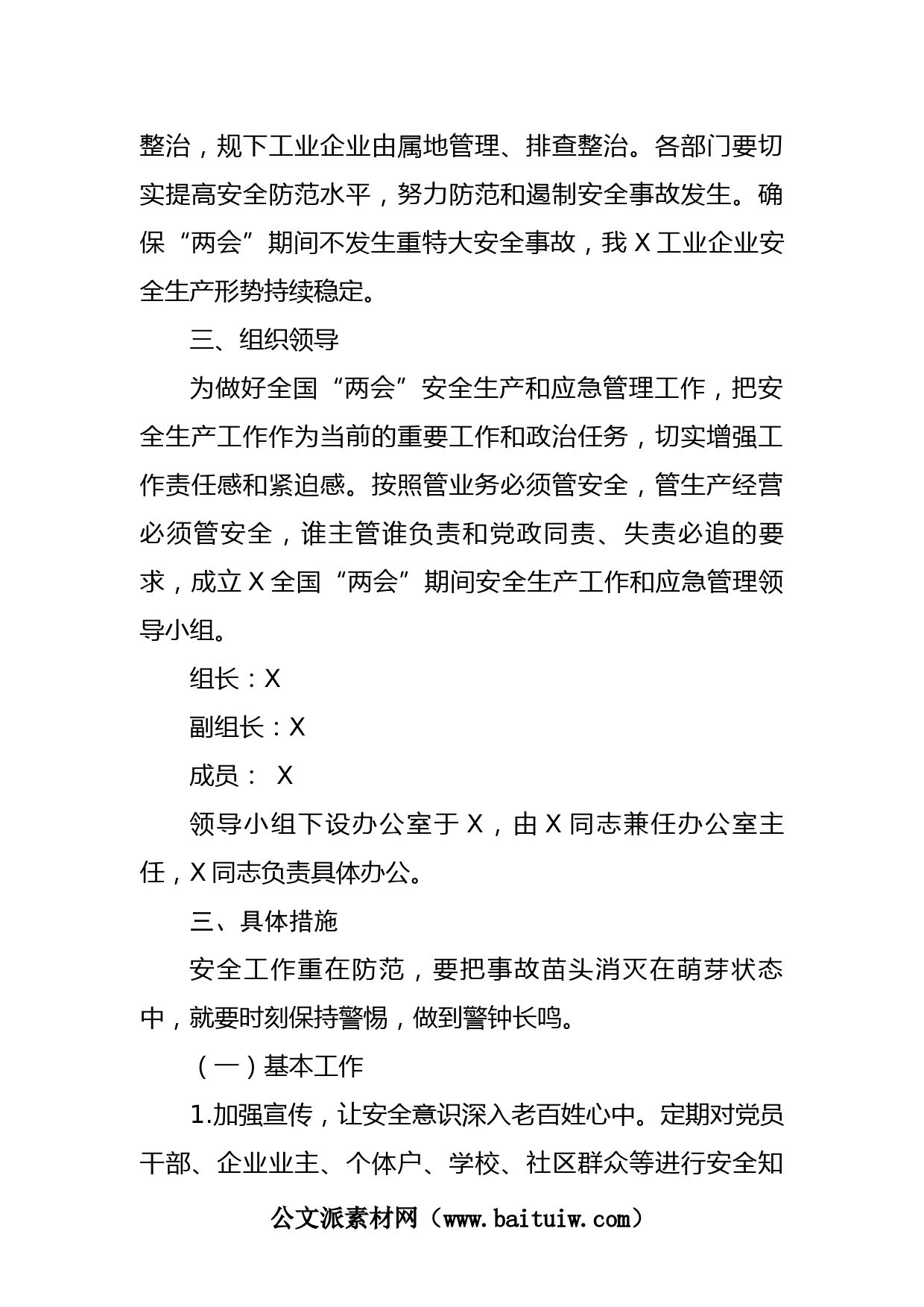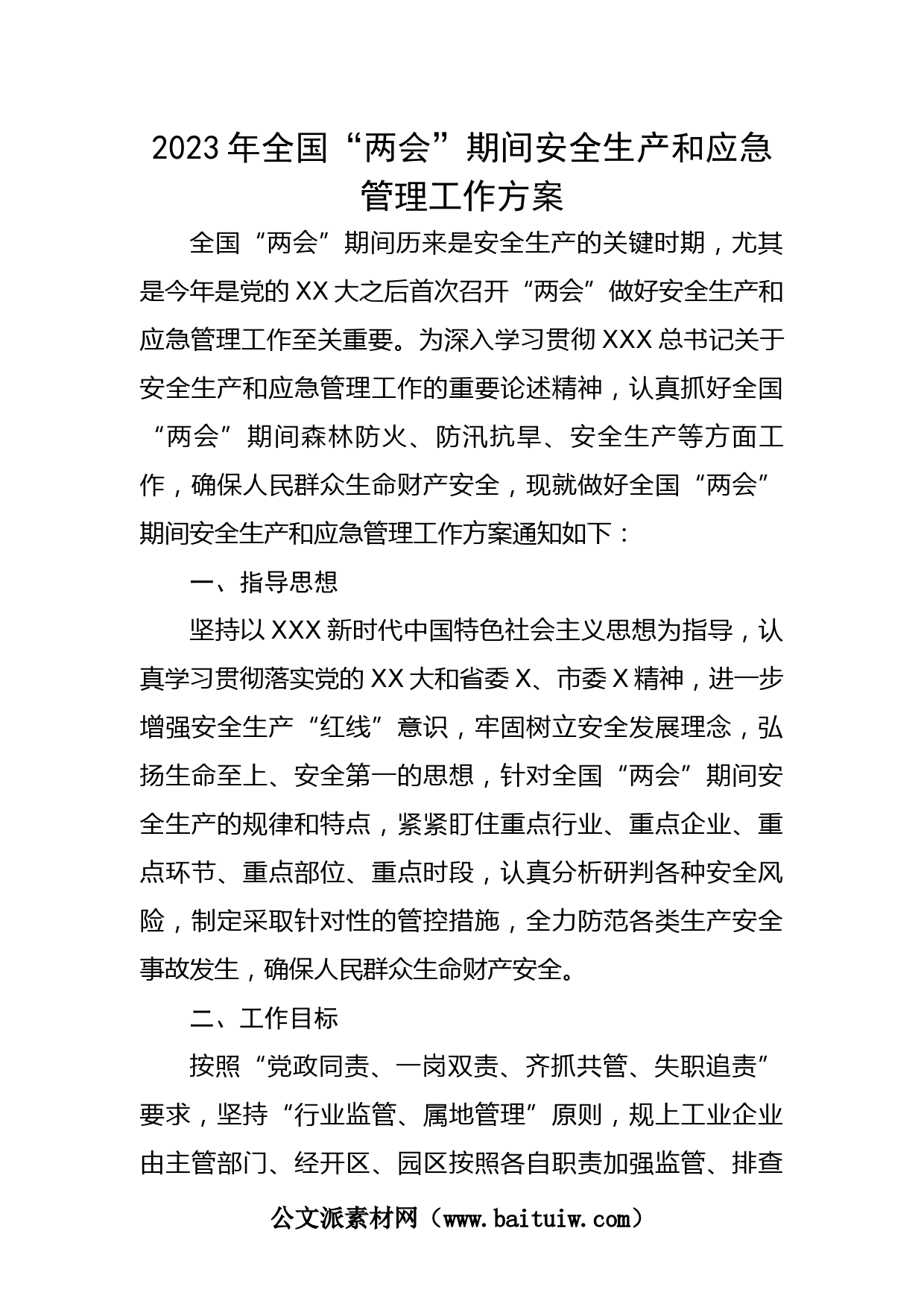 2023年全國“兩會”期間安全生產(chǎn)和應(yīng)急管理工作方案全國“兩會”期間歷來是安全生產(chǎn)的關(guān)鍵時期,尤其是今年是黨的XX大之后首次召開“兩會”做好安全生產(chǎn)和應(yīng)急管理工作至關(guān)重要。為深入學(xué)習(xí)貫徹XXX總書記關(guān)于安全生產(chǎn)和應(yīng)急管理工作的重要論述精神,認真抓好全國“兩會”期間森林防火、防汛抗旱、安全生產(chǎn)等方面工作,確保人民群眾生命財產(chǎn)安全,現(xiàn)就做好全國“兩會”期間安全生產(chǎn)和應(yīng)急管理工作方案通知如下:一、指導(dǎo)思想堅持以XXX新時代中國特色社會主義思想為指導(dǎo),認真學(xué)習(xí)貫徹落實黨的XX大和省委X、市委X精神,進一步增強安全生產(chǎn)“紅線”意識,牢固樹立安全發(fā)展理...