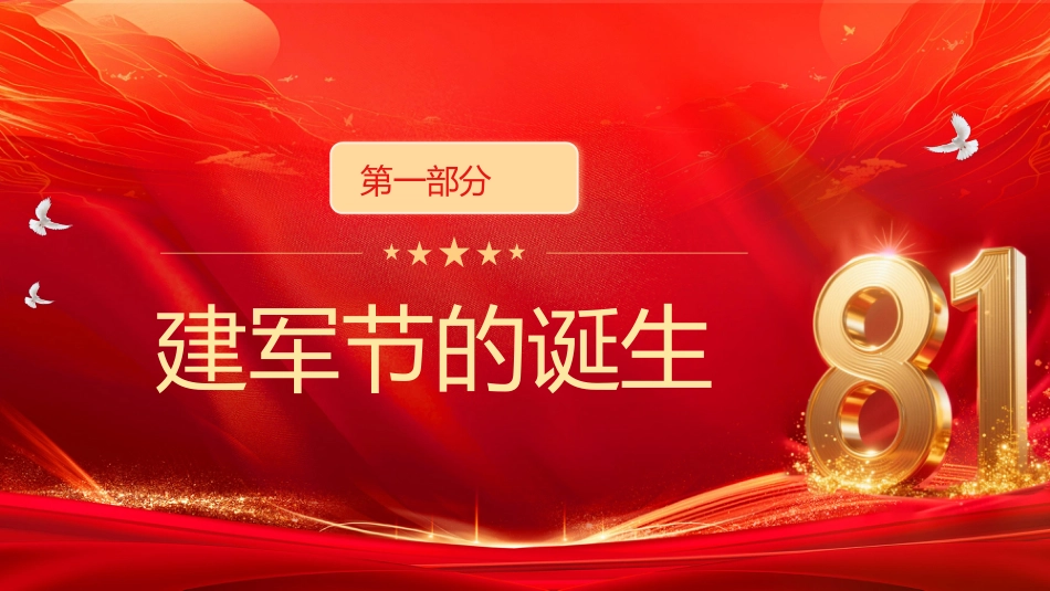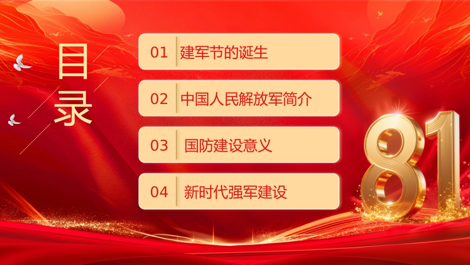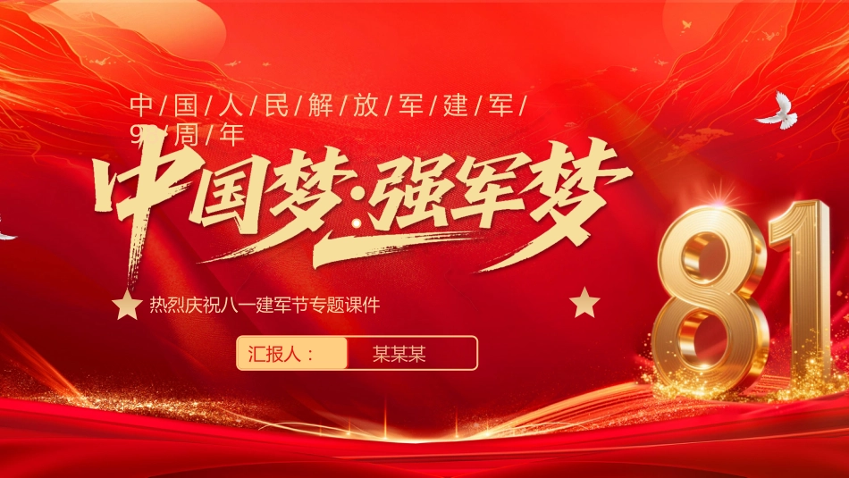 匯報(bào)人:某某某中/國/人/民/解/放/軍/建/軍/98/周/年熱烈慶祝八一建軍節(jié)專題課件目錄建軍節(jié)的誕生01中國人民解放軍簡(jiǎn)介02國防建設(shè)意義03新時(shí)代強(qiáng)軍建設(shè)04建軍節(jié)的誕生第一部分建軍節(jié)的誕生南昌起義八一南昌起義,指的是中國共產(chǎn)黨為了反抗國民黨反動(dòng)派的屠殺政策,挽救中國革命,1927年8月1日由中國共產(chǎn)黨領(lǐng)導(dǎo)并發(fā)動(dòng)的在江西南昌針對(duì)中國國民黨反動(dòng)迫害的武裝起義打響了武裝反抗國民黨反動(dòng)派的第一槍創(chuàng)立了中國共產(chǎn)黨領(lǐng)導(dǎo)的正規(guī)軍事武裝力量揭開了中國共產(chǎn)黨獨(dú)立領(lǐng)導(dǎo)武裝斗爭(zhēng)和創(chuàng)建革命軍隊(duì)的序幕建軍節(jié)的誕生1933年7月11日,中華蘇維埃共和國臨時(shí)中央政府根據(jù)中央革命軍...