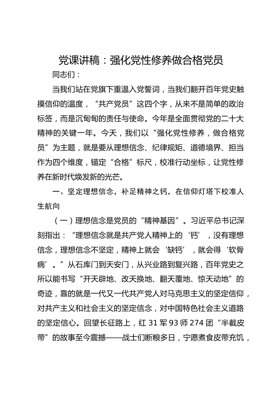 黨課講稿:強化黨性修養(yǎng)做合格黨員同志們:當我們站在黨旗下重溫入黨誓詞,當我們翻開百年黨史觸摸信仰的溫度,“共產(chǎn)黨員”這四個字,從來不是簡單的政治標簽,而是沉甸甸的責任與使命。今年是全面貫徹黨的二十大精神的關鍵一年。今天,我們以“強化黨性修養(yǎng),做合格黨員”為主題,就是要從理想信念、紀律規(guī)矩、道德境界、擔當作為四個維度,錨定“合格”標尺,校準行動坐標,讓黨性修養(yǎng)在新時代煥發(fā)新的光芒。一、堅定理想信念,補足精神之鈣,在信仰燈塔下校準人生航向(一)理想信念是黨員的“精神基因”。習近平總書記深刻指出:“理想信念就是共產(chǎn)黨人精神上的‘鈣...