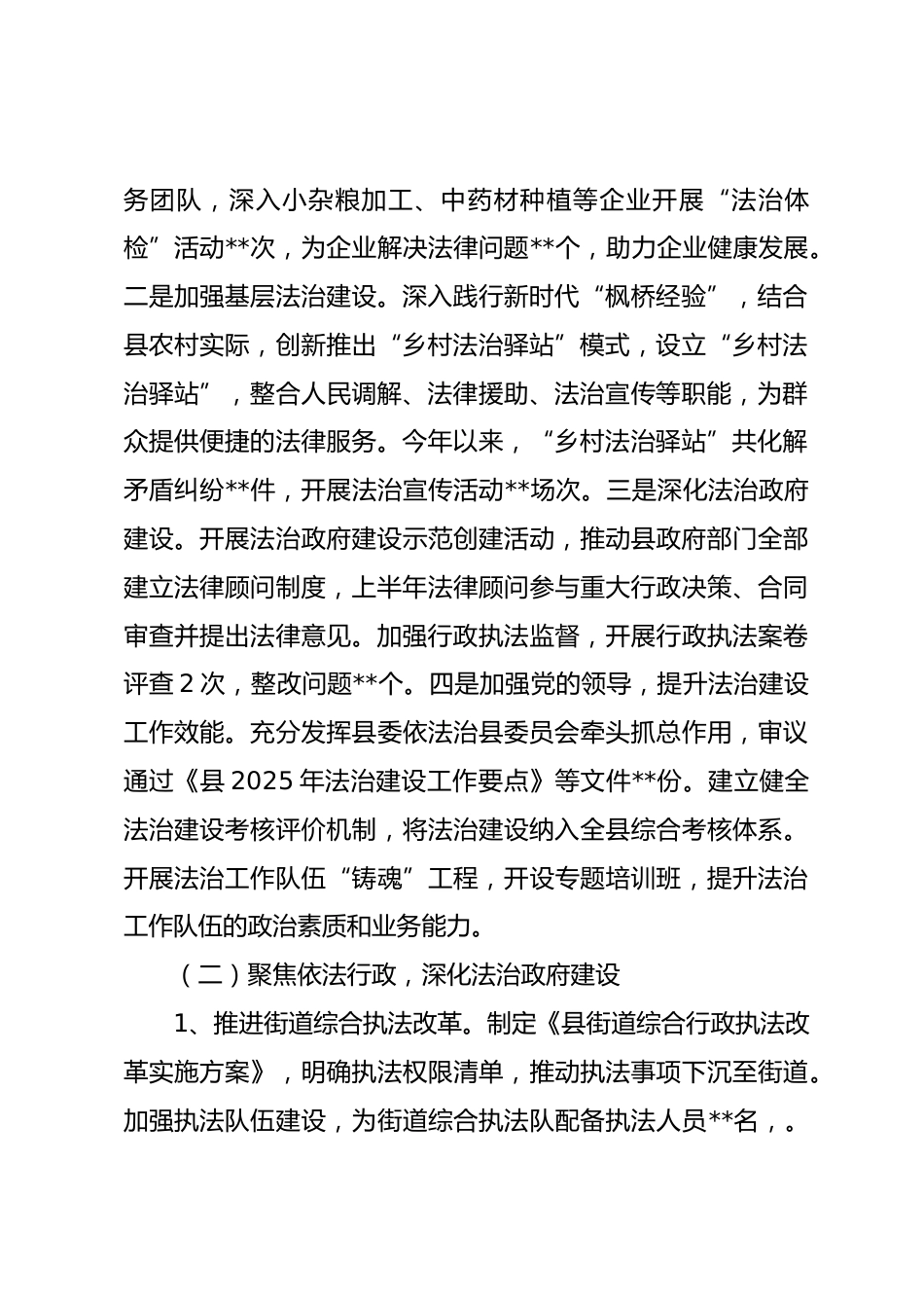 縣司法局2025年上半年工作總結(jié)和2025年下半年工作計劃2025年上半年,縣司法局堅持以習(xí)近平法治思想為指導(dǎo),深入貫徹落實(shí)黨的二十大精神,緊緊圍繞縣委、縣政府中心工作,以“八五”普法規(guī)劃為主線,以提升公民法治素養(yǎng)為總抓手,統(tǒng)籌推進(jìn)法治建設(shè)和司法行政各項(xiàng)工作,為全縣經(jīng)濟(jì)社會高質(zhì)量發(fā)展提供了堅實(shí)的法治保障?,F(xiàn)將上半年工作情況總結(jié)如下,并對下半年工作作出計劃安排。一、上半年工作開展情況(一)強(qiáng)化統(tǒng)籌協(xié)調(diào),全面推進(jìn)依法治縣深學(xué)篤行習(xí)近平法治思想。將學(xué)習(xí)習(xí)近平法治思想納入縣委理論學(xué)習(xí)中心組重點(diǎn)學(xué)習(xí)內(nèi)容,制定詳細(xì)學(xué)習(xí)計劃,上半年組織專題學(xué)習(xí)**次。...