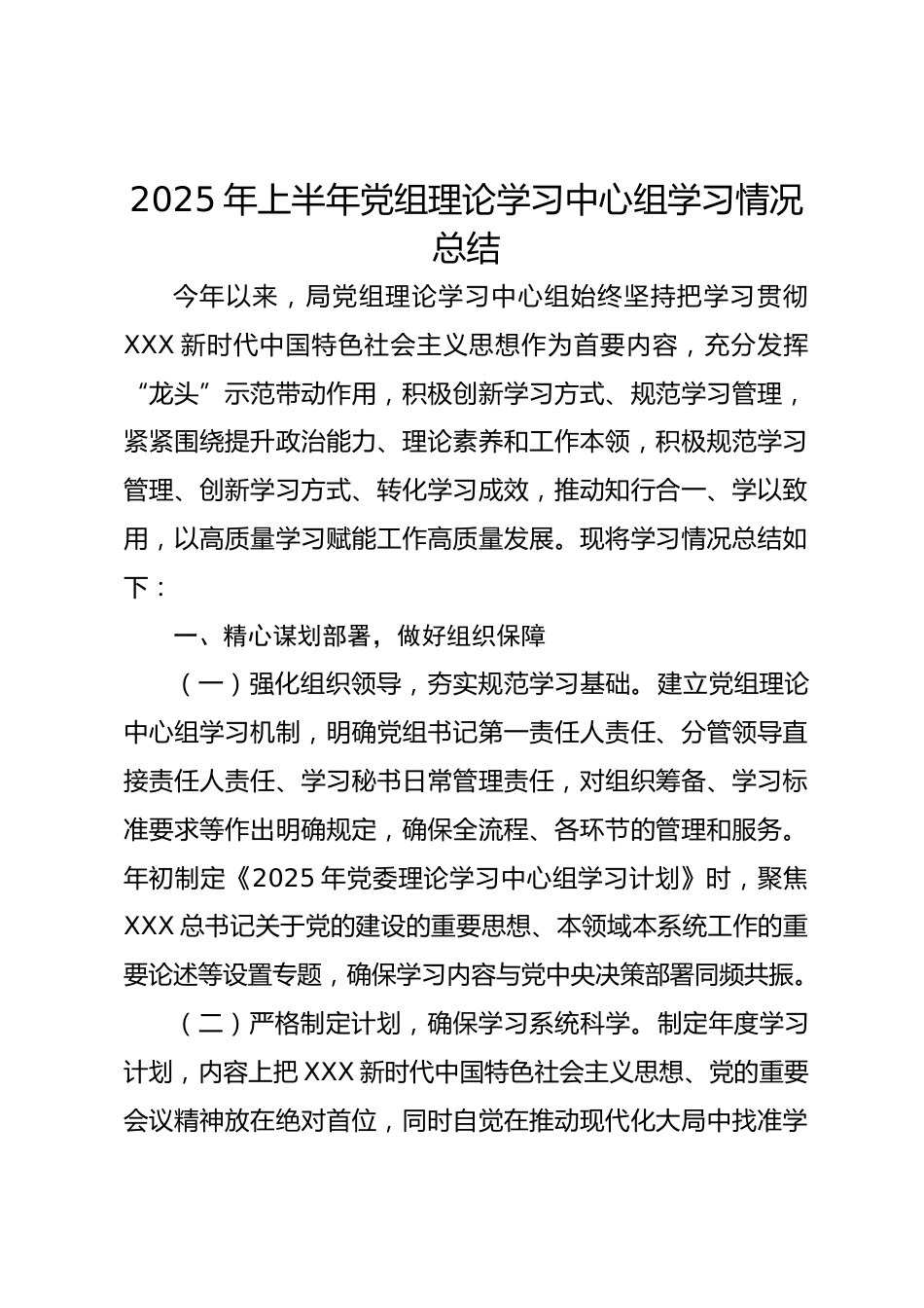 2025年上半年黨組理論學(xué)習(xí)中心組學(xué)習(xí)情況總結(jié)今年以來(lái),局黨組理論學(xué)習(xí)中心組始終堅(jiān)持把學(xué)習(xí)貫徹XXX新時(shí)代中國(guó)特色社會(huì)主義思想作為首要內(nèi)容,充分發(fā)揮“龍頭”示范帶動(dòng)作用,積極創(chuàng)新學(xué)習(xí)方式、規(guī)范學(xué)習(xí)管理,緊緊圍繞提升政治能力、理論素養(yǎng)和工作本領(lǐng),積極規(guī)范學(xué)習(xí)管理、創(chuàng)新學(xué)習(xí)方式、轉(zhuǎn)化學(xué)習(xí)成效,推動(dòng)知行合一、學(xué)以致用,以高質(zhì)量學(xué)習(xí)賦能工作高質(zhì)量發(fā)展?,F(xiàn)將學(xué)習(xí)情況總結(jié)如下:一、精心謀劃部署,做好組織保障(一)強(qiáng)化組織領(lǐng)導(dǎo),夯實(shí)規(guī)范學(xué)習(xí)基礎(chǔ)。建立黨組理論中心組學(xué)習(xí)機(jī)制,明確黨組書(shū)記第一責(zé)任人責(zé)任、分管領(lǐng)導(dǎo)直接責(zé)任人責(zé)任、學(xué)習(xí)秘書(shū)日常管理責(zé)任...