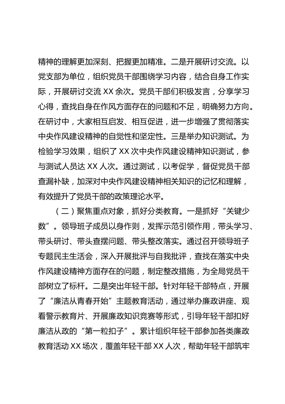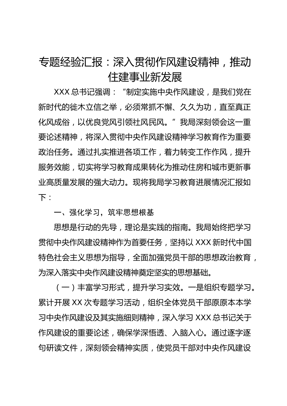 專題經(jīng)驗匯報:深入貫徹作風建設精神,推動住建事業(yè)新發(fā)展XXX總書記強調(diào):“制定實施中央作風建設,是我們黨在新時代的徙木立信之舉,必須常抓不懈、久久為功,直至真正化風成俗,以優(yōu)良黨風引領社風民風。”我局深刻領會這一重要論述精神,將深入貫徹中央作風建設精神學習教育作為重要政治任務。通過扎實推進各項工作,著力轉(zhuǎn)變工作作風,提升服務效能,切實將學習教育成果轉(zhuǎn)化為推動住房和城市更新事業(yè)高質(zhì)量發(fā)展的強大動力?,F(xiàn)將我局學習教育進展情況匯報如下:一、強化學習,筑牢思想根基思想是行動的先導,理論是實踐的指南。我局始終把學習貫徹中央作風建設精神作...