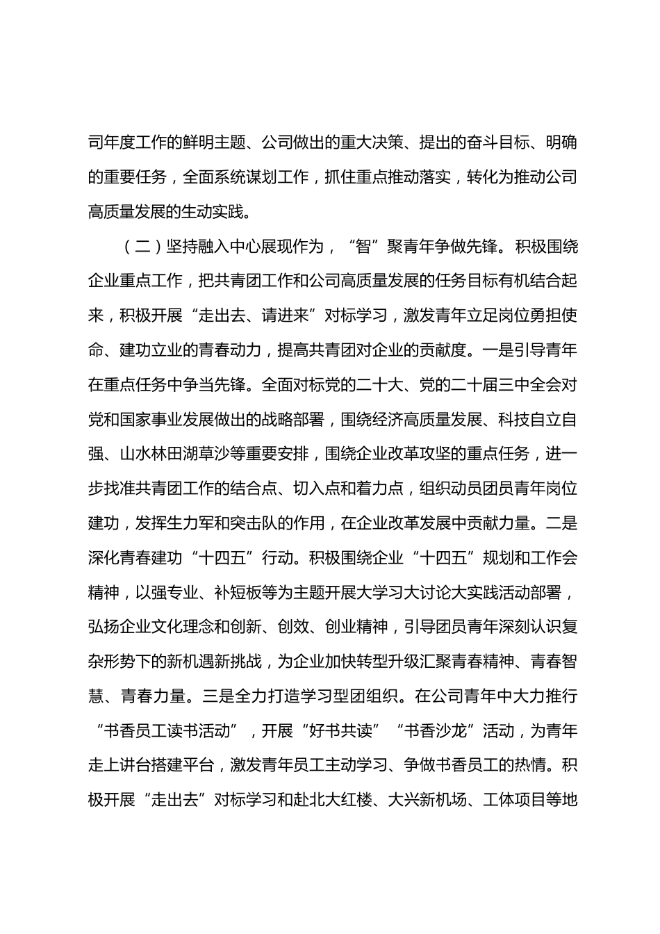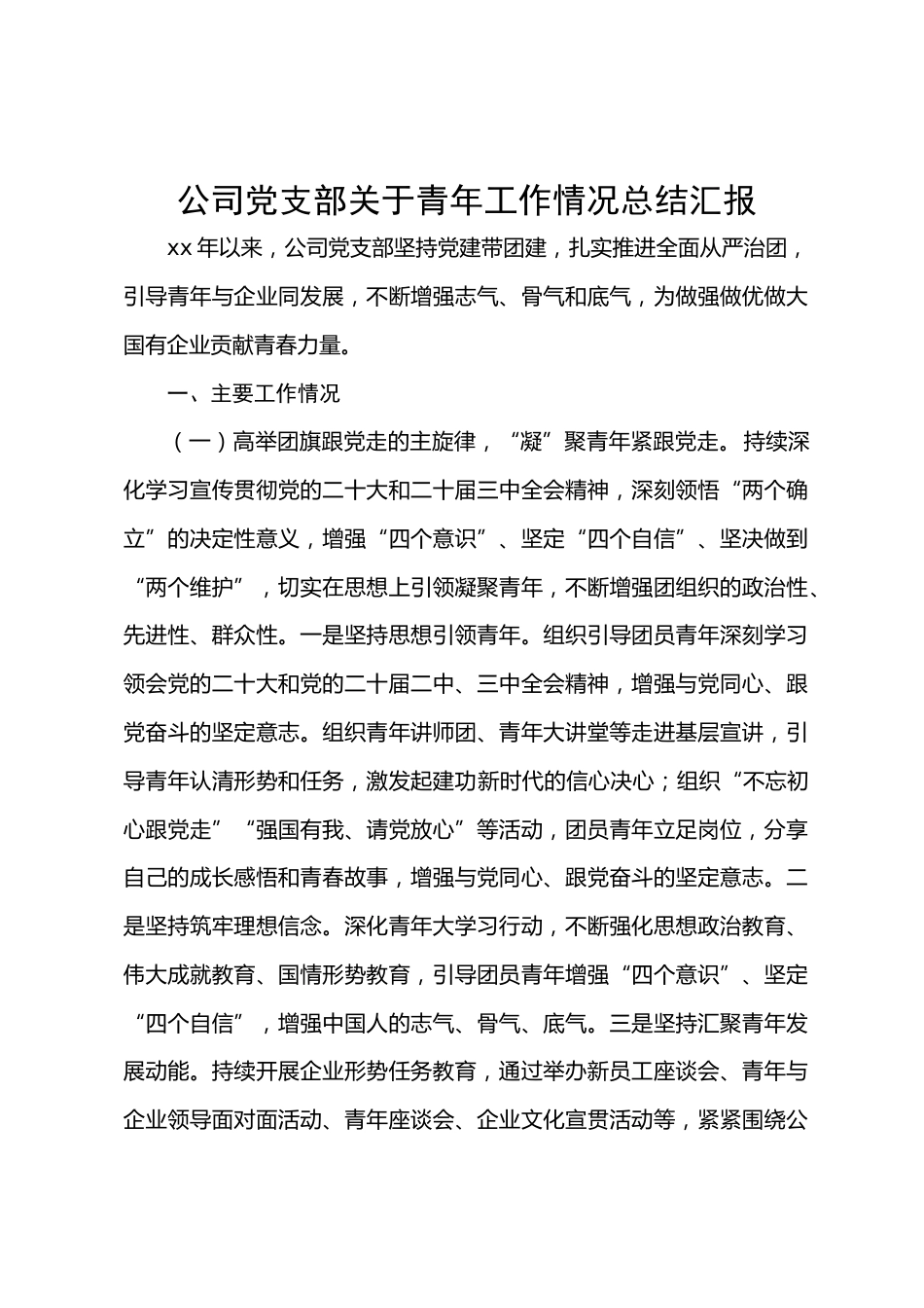 公司黨支部關(guān)于青年工作情況總結(jié)匯報(bào)xx年以來(lái),公司黨支部堅(jiān)持黨建帶團(tuán)建,扎實(shí)推進(jìn)全面從嚴(yán)治團(tuán),引導(dǎo)青年與企業(yè)同發(fā)展,不斷增強(qiáng)志氣、骨氣和底氣,為做強(qiáng)做優(yōu)做大國(guó)有企業(yè)貢獻(xiàn)青春力量。一、主要工作情況(一)高舉團(tuán)旗跟黨走的主旋律,“凝”聚青年緊跟黨走。持續(xù)深化學(xué)習(xí)宣傳貫徹黨的二十大和二十屆三中全會(huì)精神,深刻領(lǐng)悟“兩個(gè)確立”的決定性意義,增強(qiáng)“四個(gè)意識(shí)”、堅(jiān)定“四個(gè)自信”、堅(jiān)決做到“兩個(gè)維護(hù)”,切實(shí)在思想上引領(lǐng)凝聚青年,不斷增強(qiáng)團(tuán)組織的政治性、先進(jìn)性、群眾性。一是堅(jiān)持思想引領(lǐng)青年。組織引導(dǎo)團(tuán)員青年深刻學(xué)習(xí)領(lǐng)會(huì)黨的二十大和黨的二十屆二中...