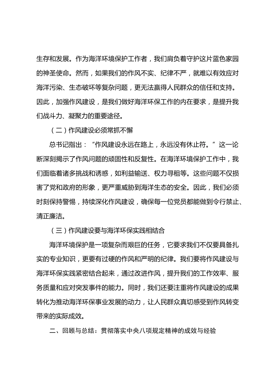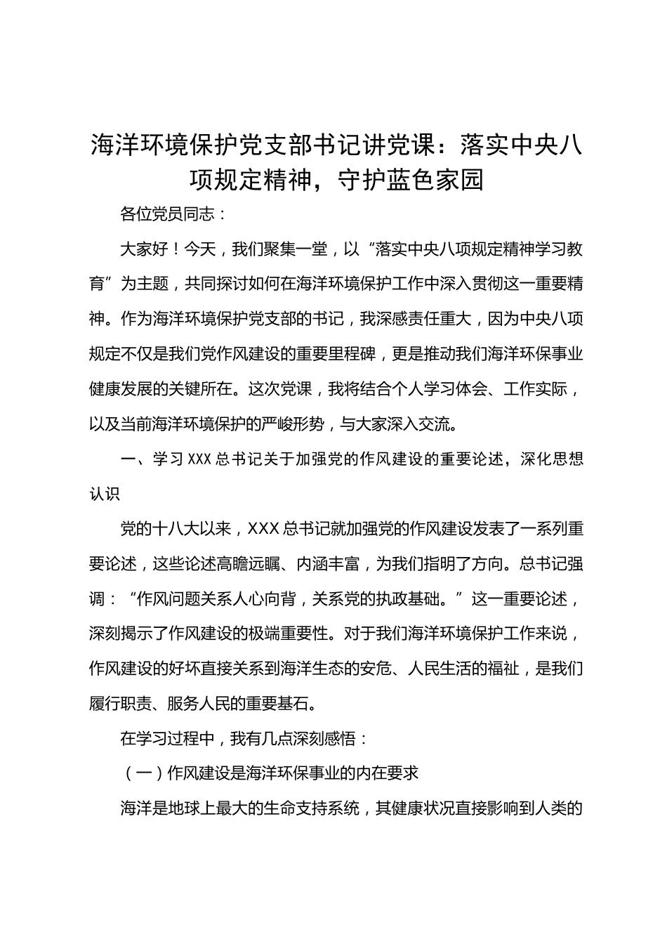 海洋環(huán)境保護(hù)黨支部書記講黨課:落實中央八項規(guī)定精神,守護(hù)藍(lán)色家園各位黨員同志:大家好!今天,我們聚集一堂,以“落實中央八項規(guī)定精神學(xué)習(xí)教育”為主題,共同探討如何在海洋環(huán)境保護(hù)工作中深入貫徹這一重要精神。作為海洋環(huán)境保護(hù)黨支部的書記,我深感責(zé)任重大,因為中央八項規(guī)定不僅是我們黨作風(fēng)建設(shè)的重要里程碑,更是推動我們海洋環(huán)保事業(yè)健康發(fā)展的關(guān)鍵所在。這次黨課,我將結(jié)合個人學(xué)習(xí)體會、工作實際,以及當(dāng)前海洋環(huán)境保護(hù)的嚴(yán)峻形勢,與大家深入交流。一、學(xué)習(xí)XXX總書記關(guān)于加強黨的作風(fēng)建設(shè)的重要論述,深化思想認(rèn)識黨的十八大以來,XXX總書記就加強黨的作...