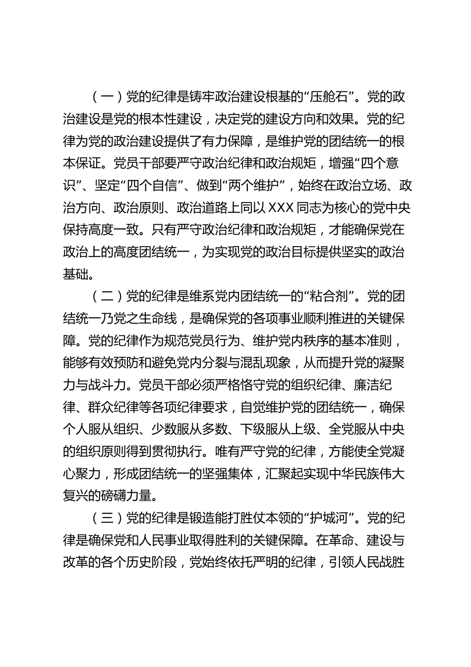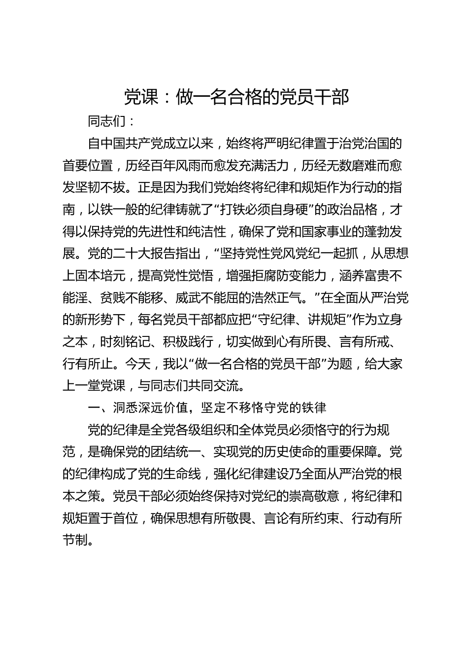 黨課:做一名合格的黨員干部同志們:自中國共產黨成立以來,始終將嚴明紀律置于治黨治國的首要位置,歷經百年風雨而愈發(fā)充滿活力,歷經無數磨難而愈發(fā)堅韌不拔。正是因為我們黨始終將紀律和規(guī)矩作為行動的指“”南,以鐵一般的紀律鑄就了打鐵必須自身硬的政治品格,才得以保持黨的先進性和純潔性,確保了黨和國家事業(yè)的蓬勃發(fā)“展。黨的二十大報告指出,堅持黨性黨風黨紀一起抓,從思想上固本培元,提高黨性覺悟,增強拒腐防變能力,涵養(yǎng)富貴不”能淫、貧賤不能移、威武不能屈的浩然正氣。在全面從嚴治黨“”的新形勢下,每名黨員干部都應把守紀律、講規(guī)矩作為立身之本,...